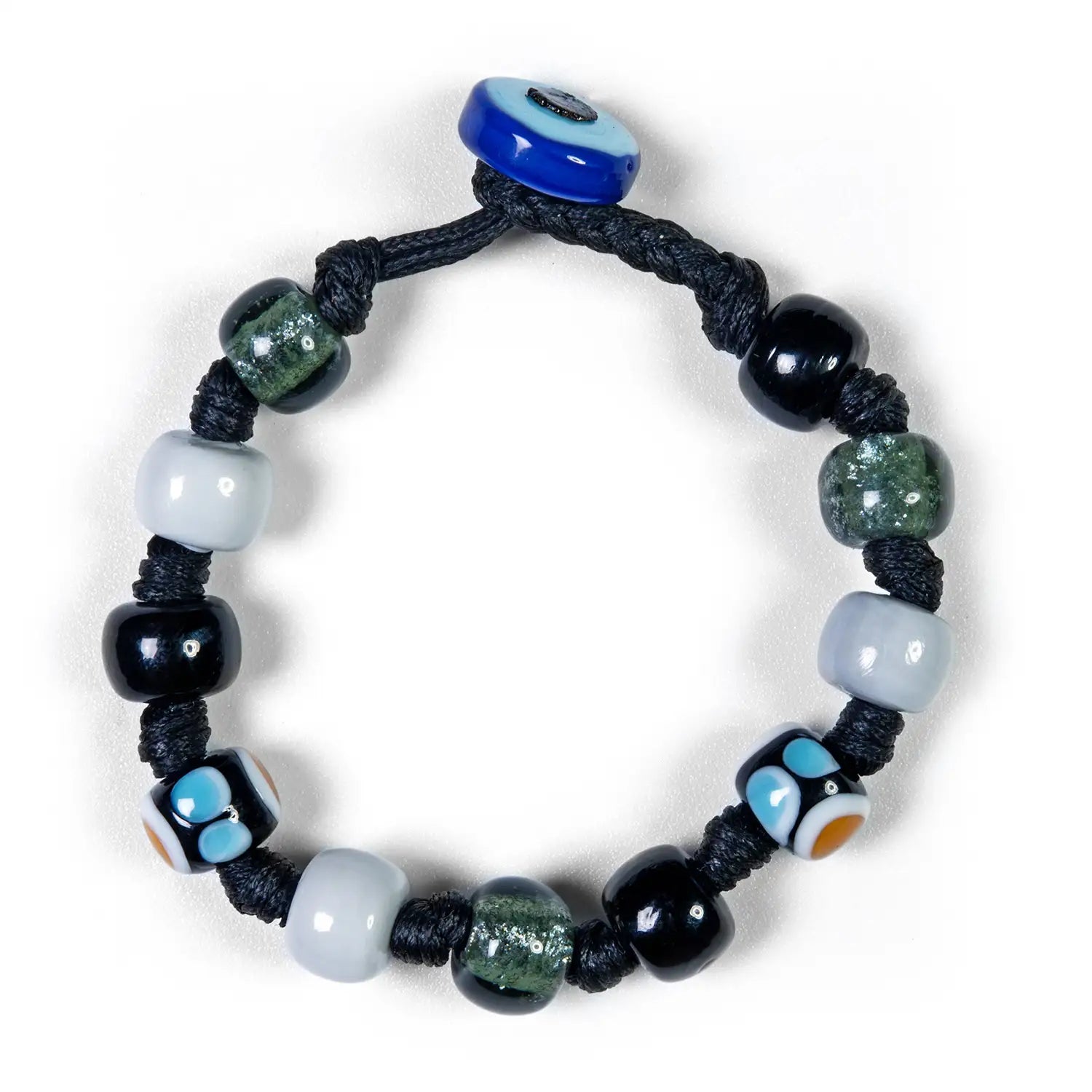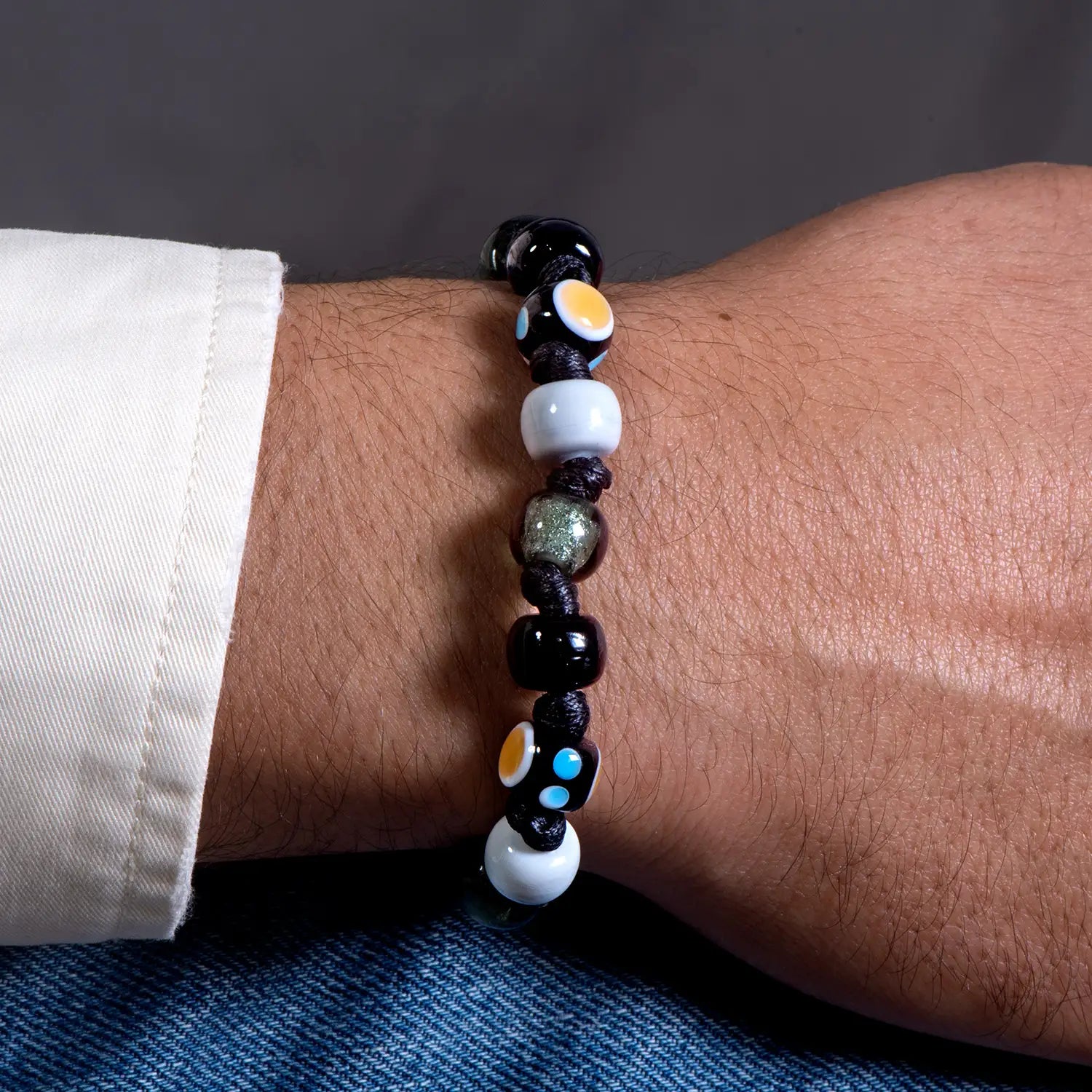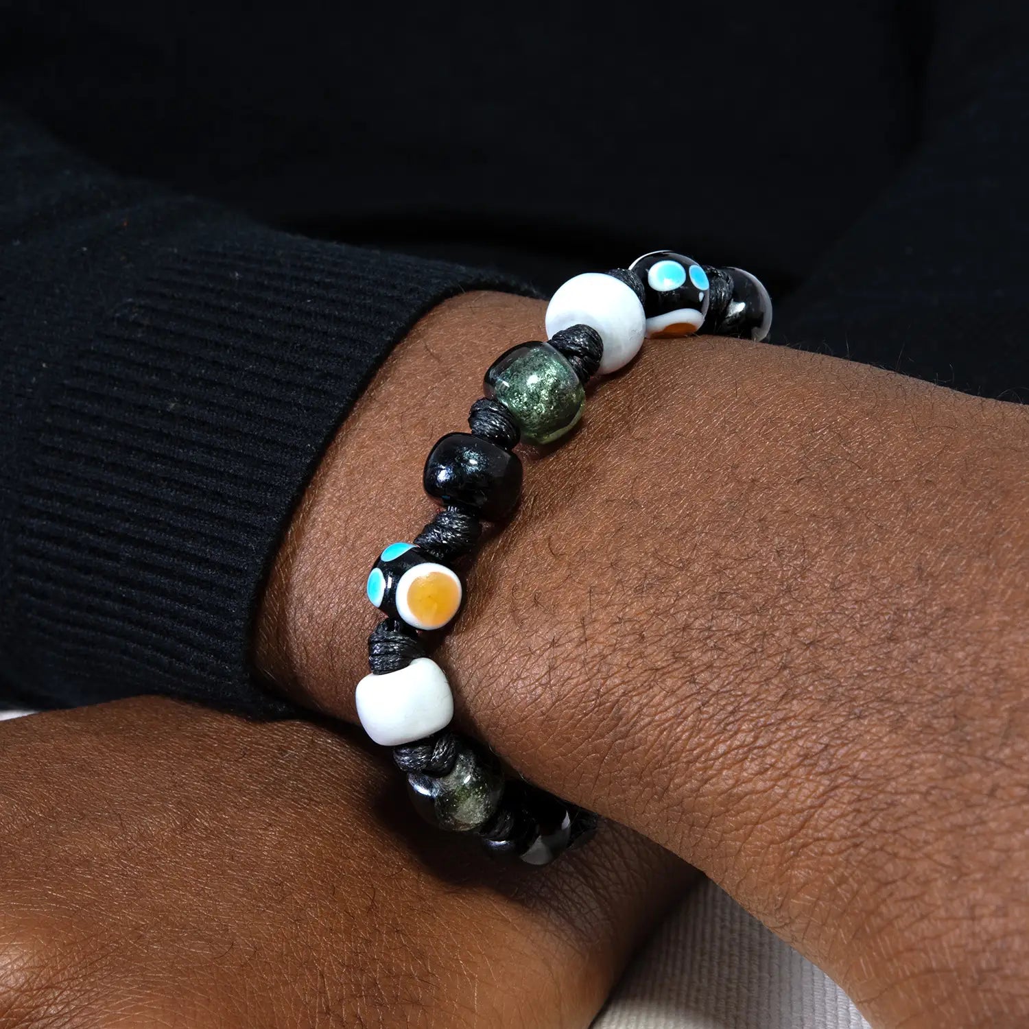 Die dunklen Töne treffen auf helle Einsätze und Farbakzente und schaffen eine ausgewogene Mischung, die jedem Outfit Charakter verleiht – vom Alltag bis zum anspruchsvollen Look. Die handgeflochtene Schnur sorgt für Komfort und Haltbarkeit und unterstreicht die handwerkliche Ästhetik des Armbands. Auch perfekt für Abende mit Freunden, ist es ein Accessoire, das man gerne trägt und das mit natürlicher Eleganz auffällt.