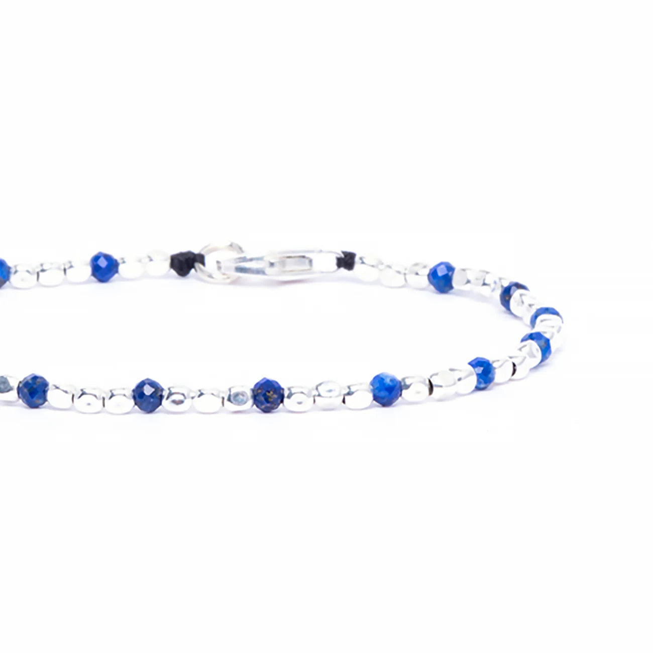Selen ist ein handgefertigtes Herrenarmband aus Italien, gefertigt mit Elementen aus 925er Silber und strukturiert mit einem wasserfesten, geflochtenen Nylonfaden. Dieses Herrenarmband ist mit 3 mm facettierten Lapislazuli-Halbedelsteinen verziert. Es verfügt über einen Karabinerverschluss.