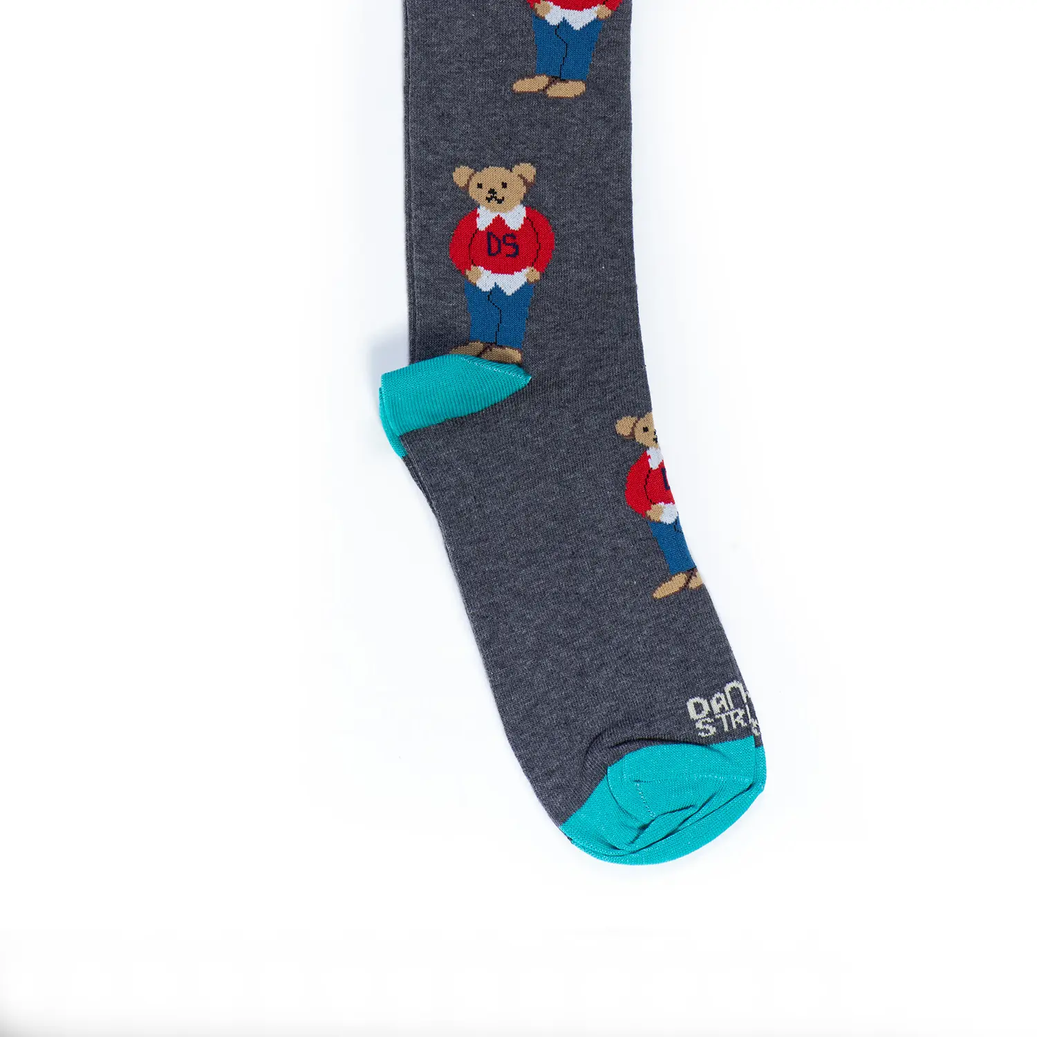 These high-quality soft cotton socks feature a fun and original design with cute bears dressed in red shirts and blue pants with Dandy Street initials, set against an elegant light gray background. The cuff, toes, and heels create a pleasant contrast with their vibrant turquoise, adding a pop of color.