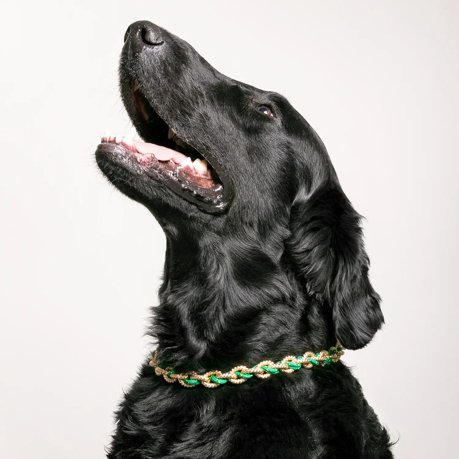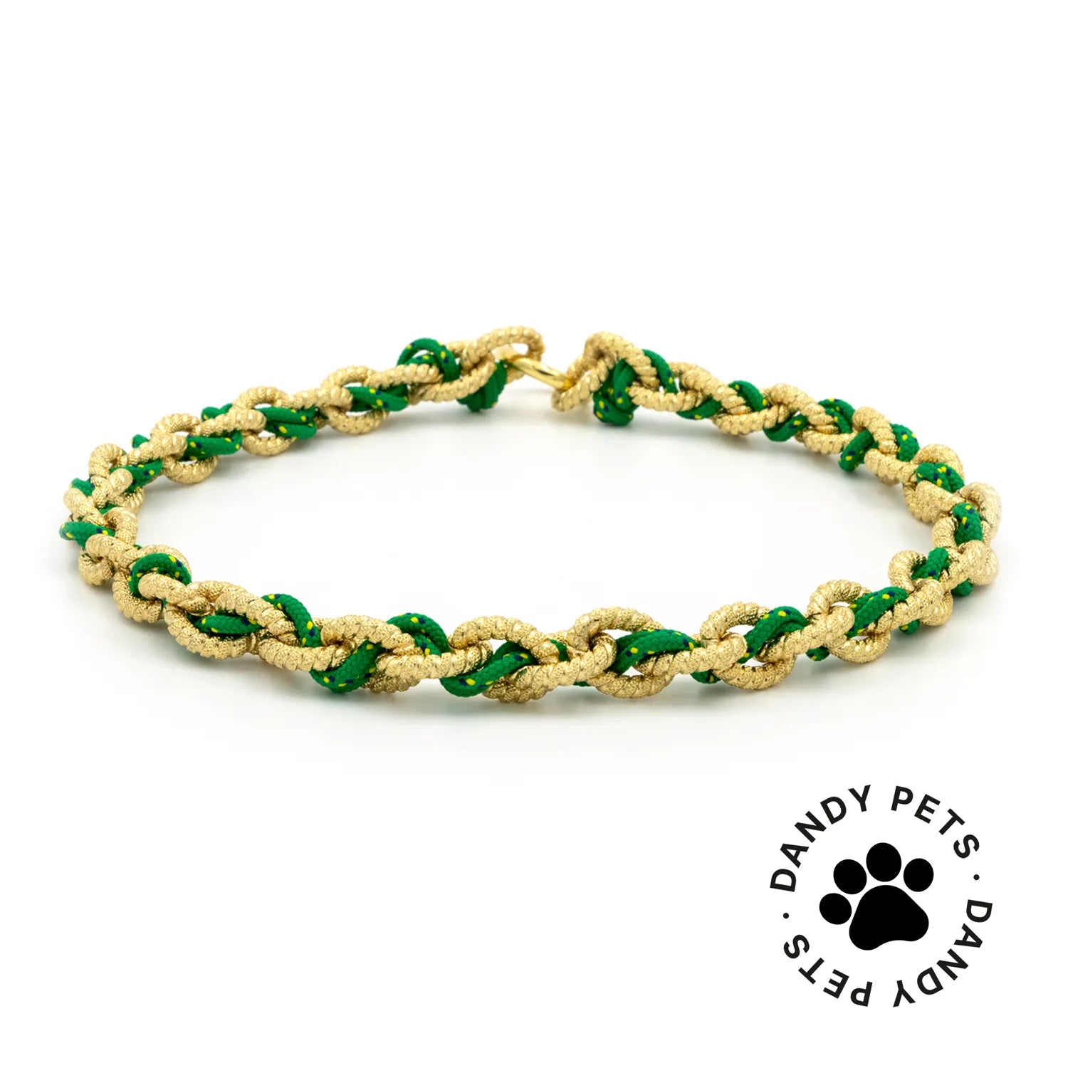 - Materials: Knurled aluminum chain plated in gold with a diameter of 16mm; the collar is enhanced with a double braided green paracord