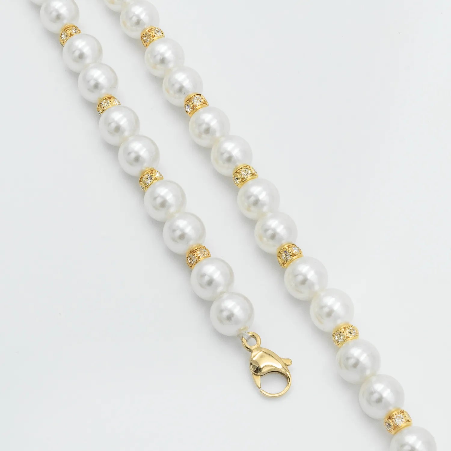 - Materials: The necklace structure is made of water-resistant braided nylon cord; the necklace is crafted with 14mm eco-friendly freshwater pearls and metal spacers with rhinestones