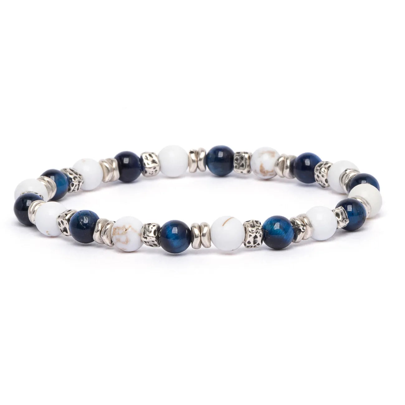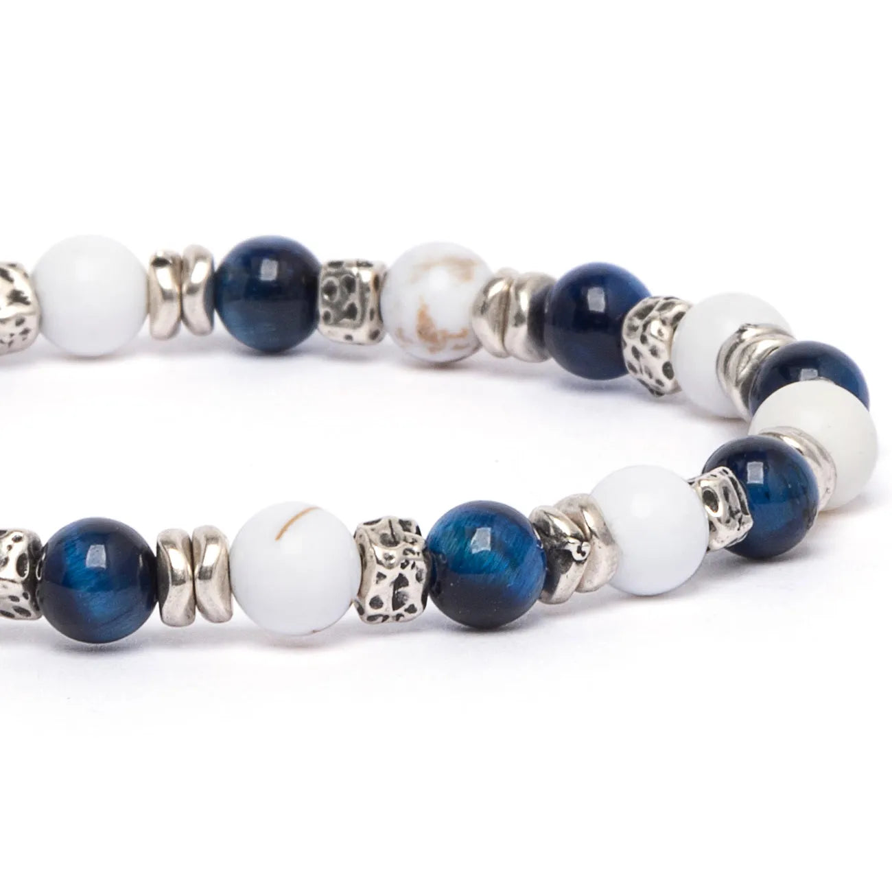 Ariel is a men's stretch bracelet handmade with natural blue tiger's eye and white aulite stones, sized 6mm. The findings of this men's bracelet are plated with 5-micron silver.