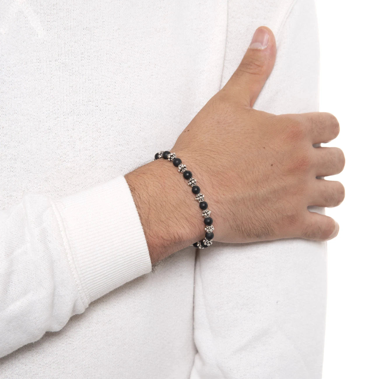 The matte onyx stones add an elegant and minimalist touch, giving the bracelet a contemporary and timeless charm. The design alternates natural stones and metal details, creating a refined visual balance.