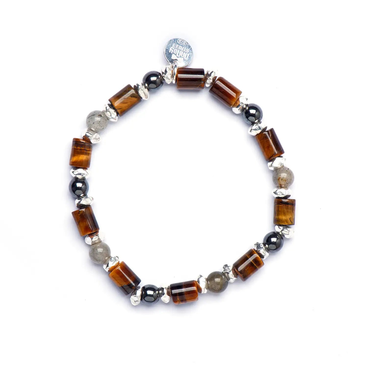 Virgilio is a men's bracelet handmade in Italy, an elegant accessory with great character: the design combines the brightness of 925 silver with the warm shades of tiger's eye, the depth of hematite, and the shimmering reflections of labradorite.