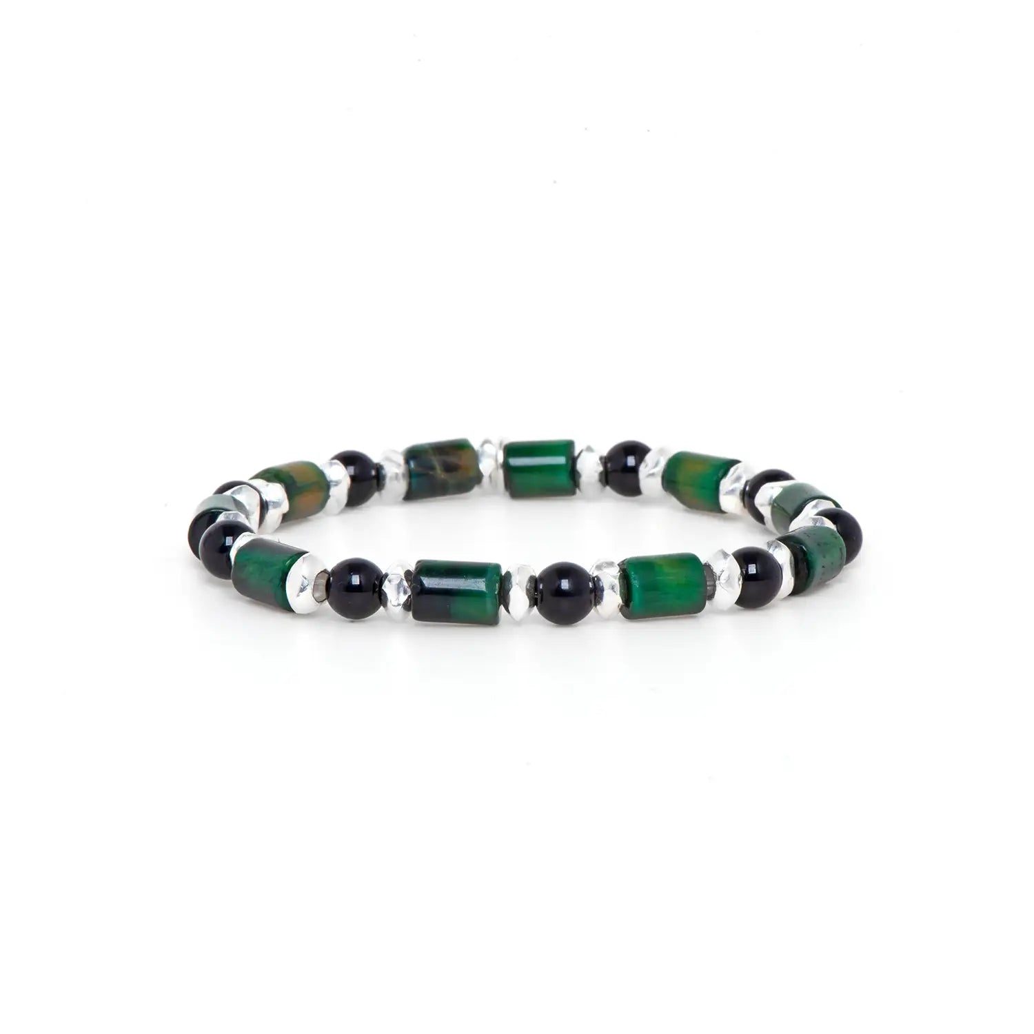 Elvino is a men's bracelet handmade in Italy, an elegant accessory with a refined design: the bracelet combines the shine of green tiger's eye with the depth of glossy black onyx, framed by 925 silver details.