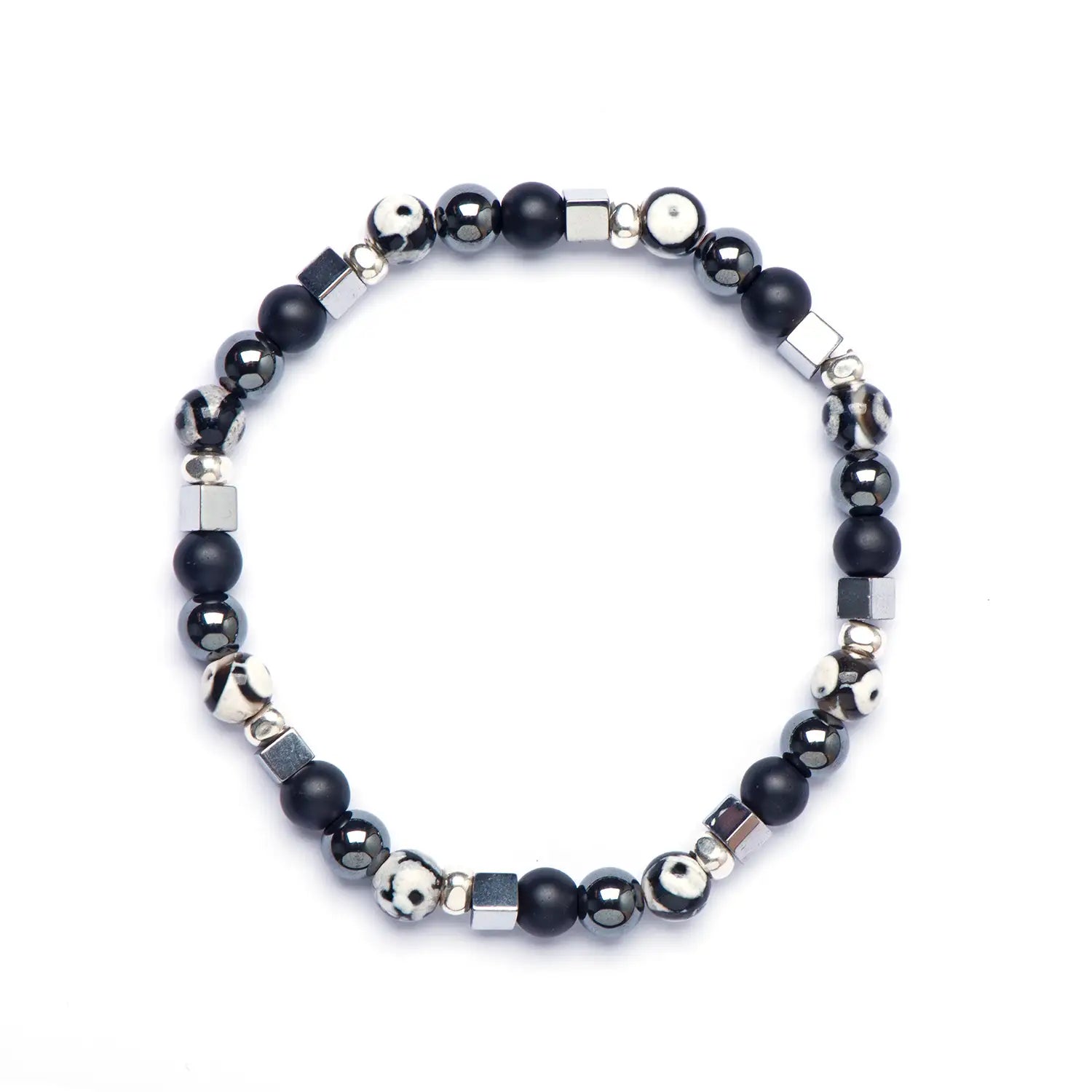 - Stones: 6 mm matte onyx beads, 6 mm glossy gray hematite pearl-cut, 5 mm silver hematite square-cut, and 6 mm agate beads with white and gray shades