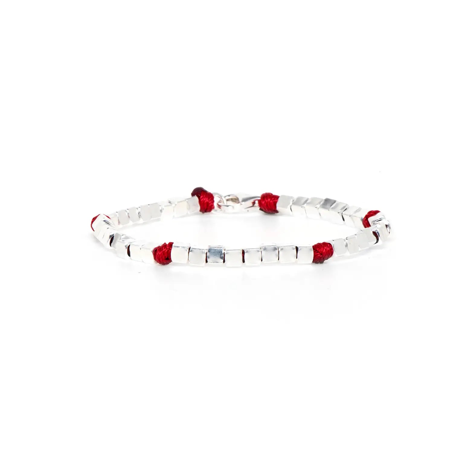 Letis is a men's bracelet handmade in Italy, an original and refined accessory: featuring square-shaped 925 silver nuggets, connected by bright red braided wire knots, it combines an essential design with striking visual details.