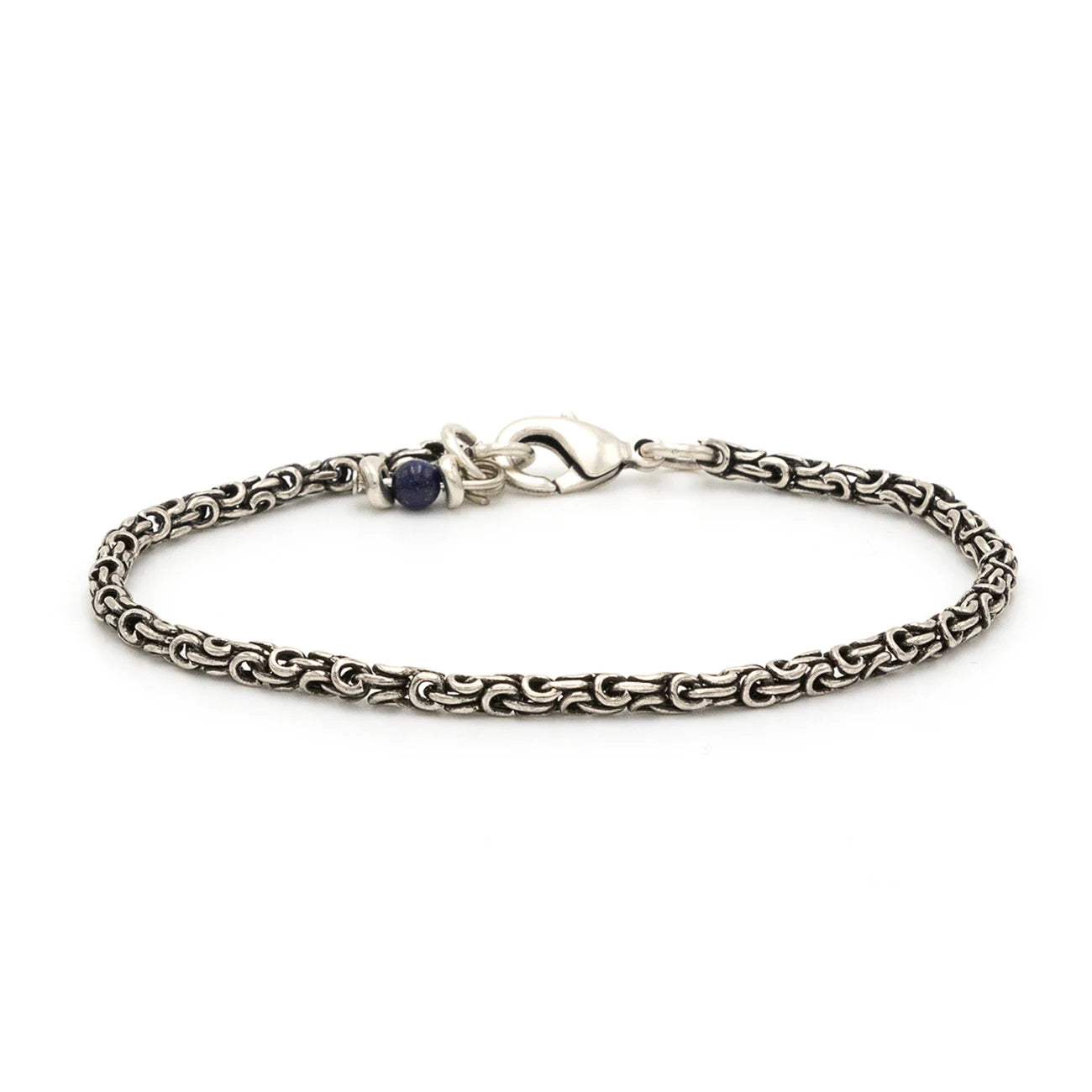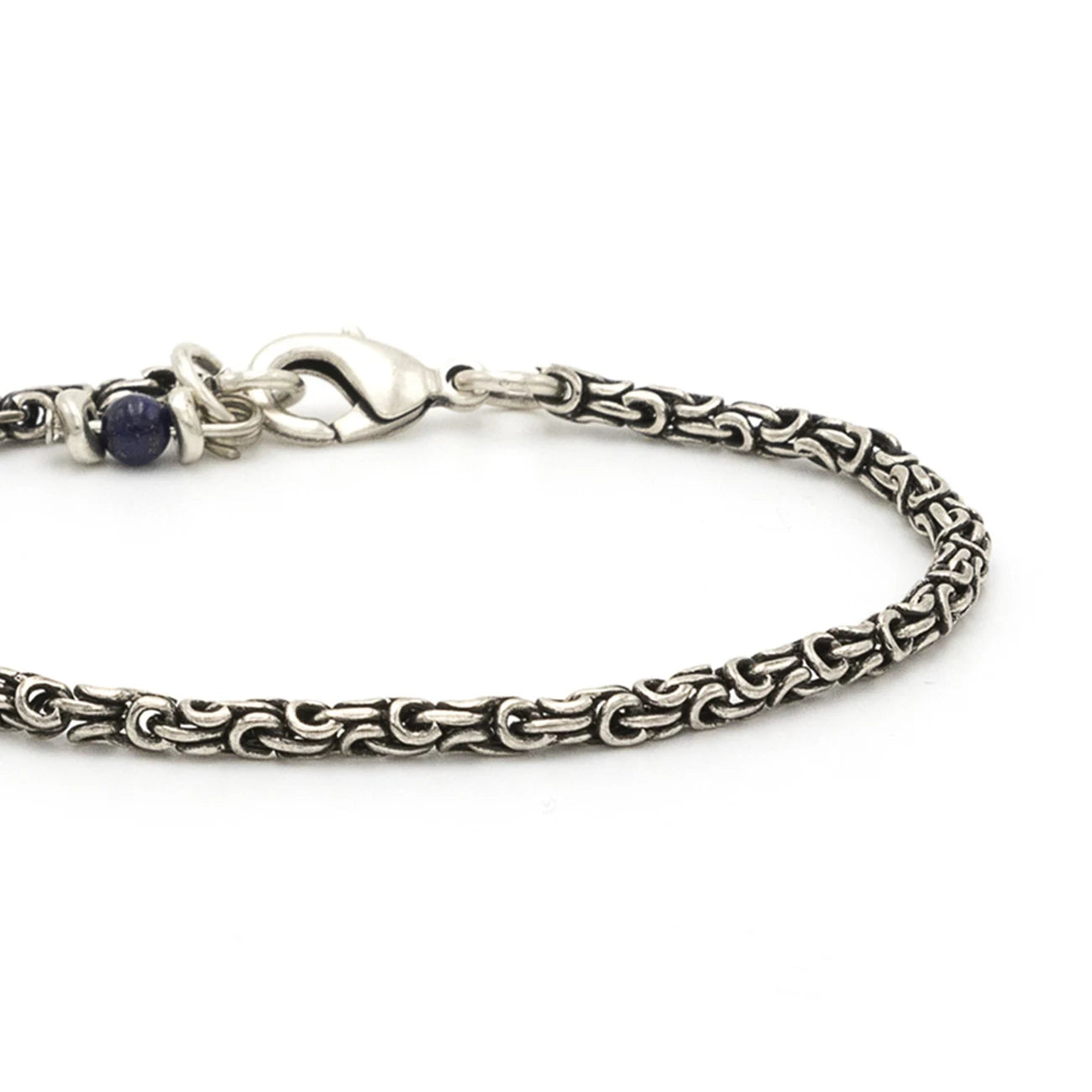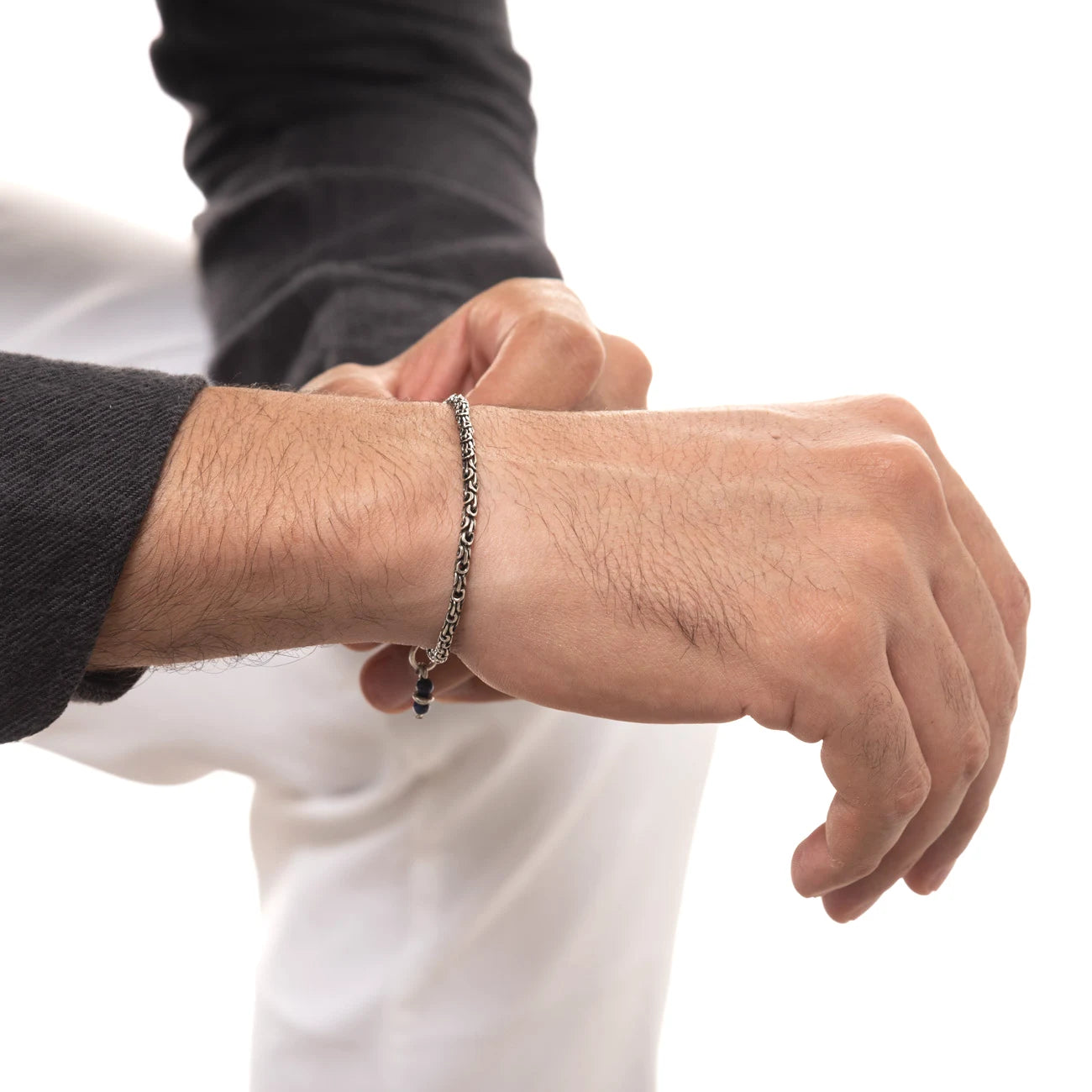 Nyx is a unique men's bracelet, handmade in Italy with a refined Byzantine link chain. The Byzantine chain, with its intricate interwoven links, symbolizes elegance and sophistication. The glass bead pendant adds a touch of color and personality. This bracelet is perfect to complete your everyday look, adapting to various outfits thanks to its versatility. The 5-micron silver plating ensures high quality and long-lasting durability. Wear it with casual or formal attire to express your unique and sophisticated style.