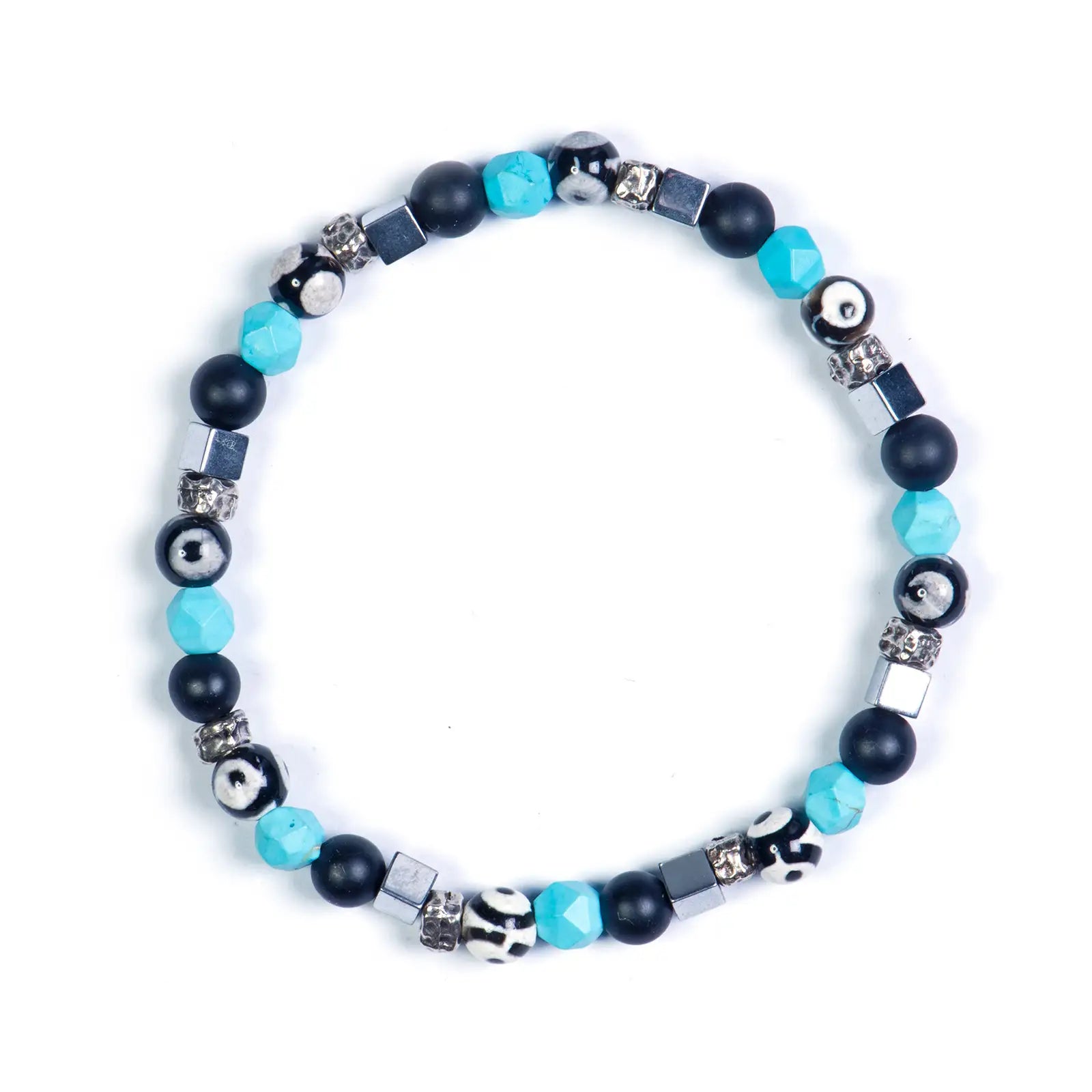 - Stones: Agate with black and white shades, 6 mm pearl cut, silver hematite with 5 mm square cut, blue aulite with 5 mm faceted cut, and 6 mm matte black onyx beads
