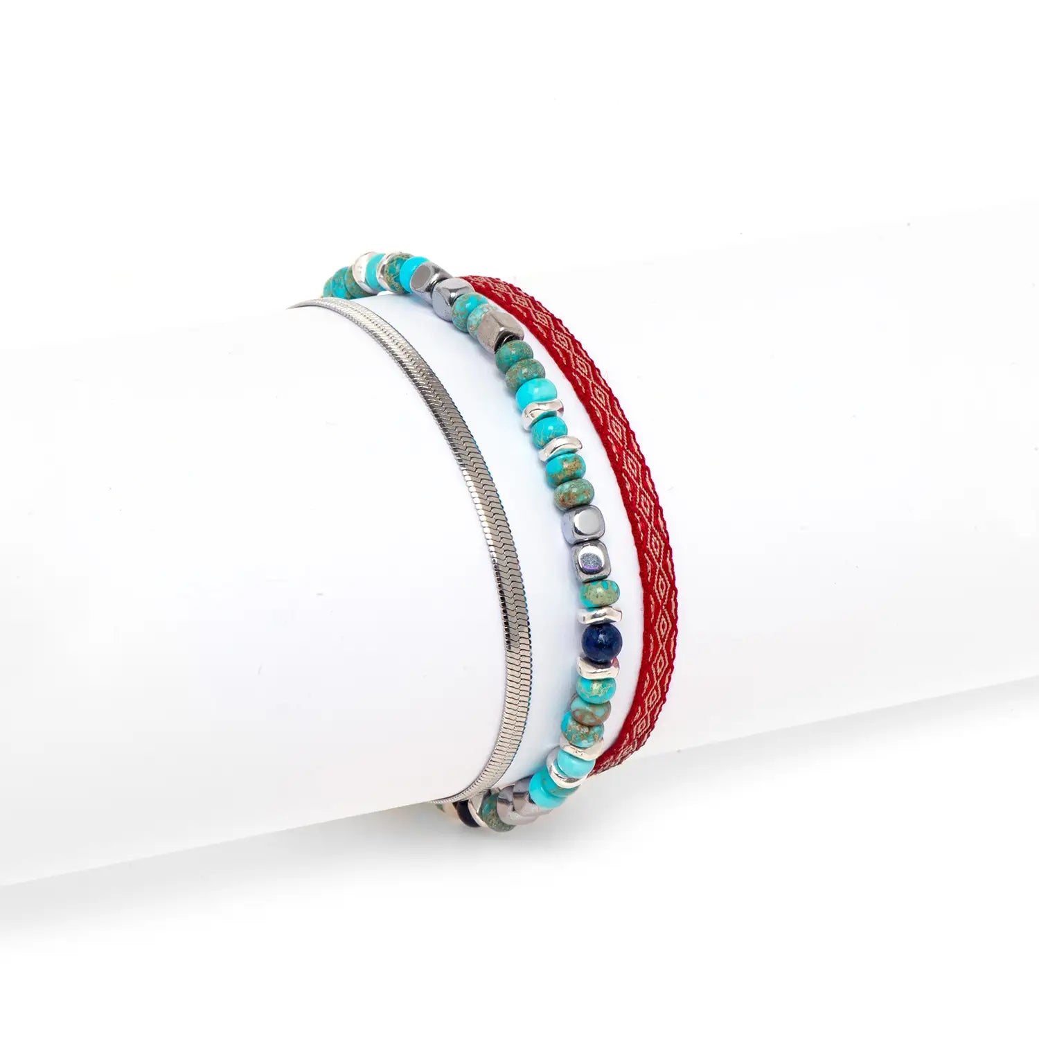 A set of three elegant and distinctive men's bracelets: turquoise stones for a fresh touch, a silver snake chain for a refined look, and a red ribbon with geometric details for a lively accent. A perfect and versatile gift.