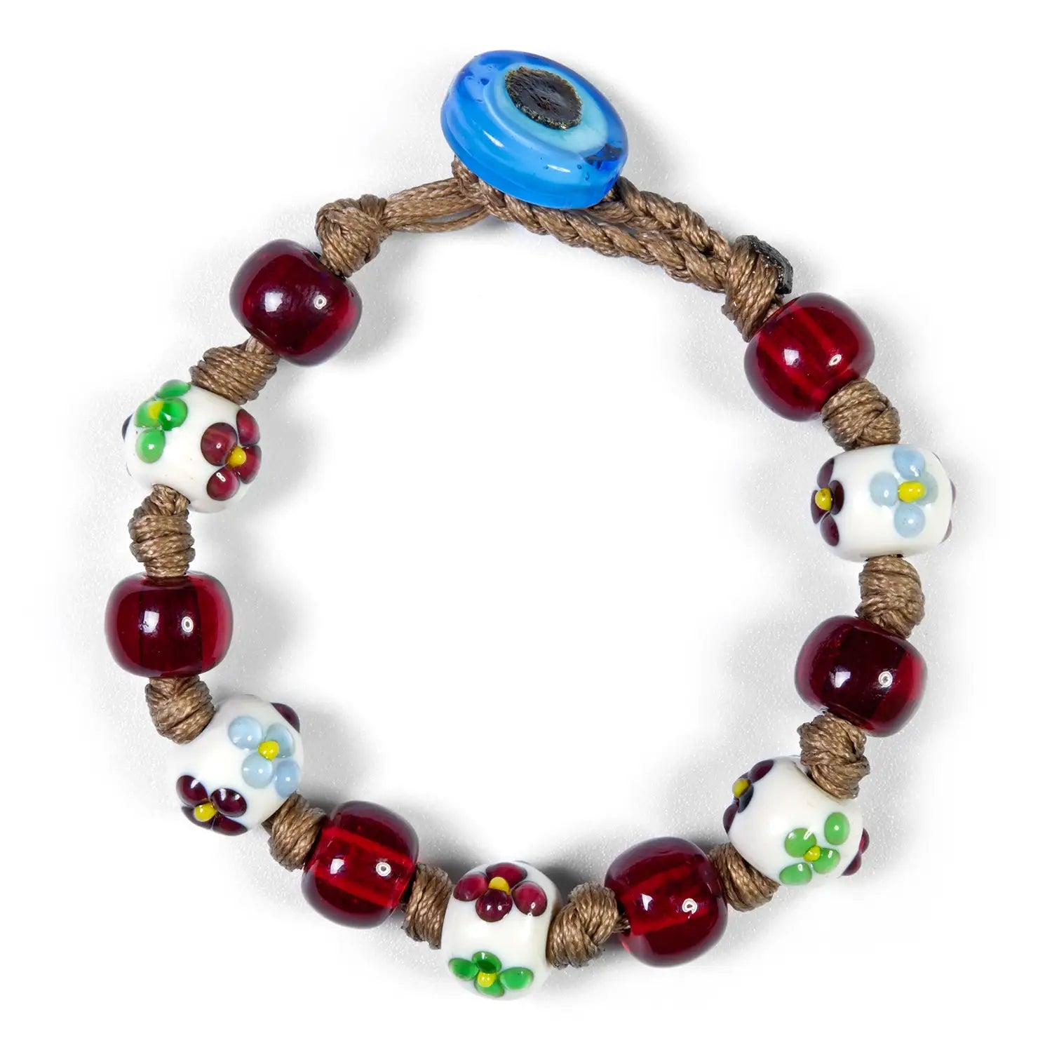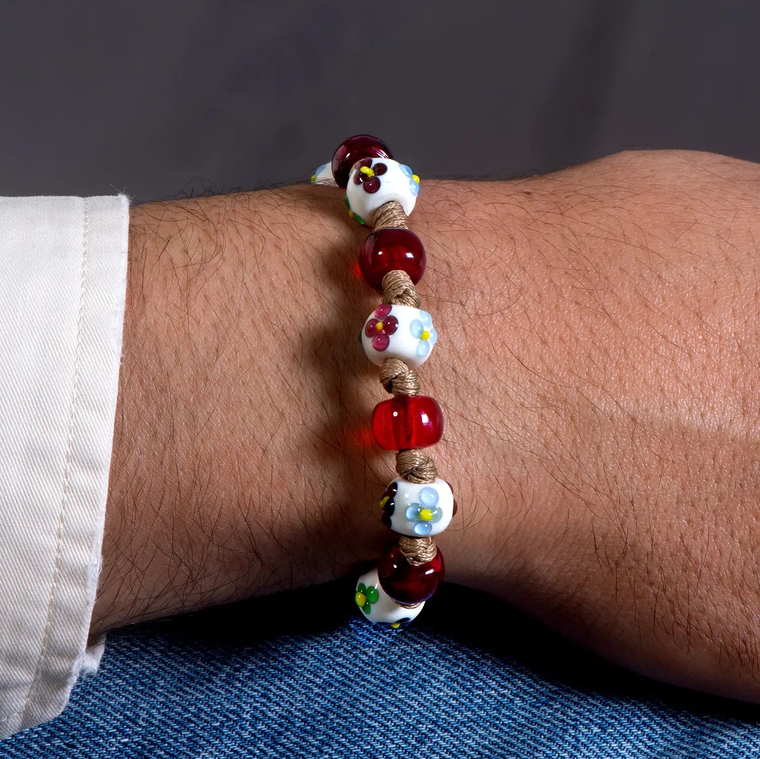 Sospiri is a men's bracelet handmade in Italy with authentic Venetian murrine made of Murano glass, a lively and refined accessory designed for those who love an original and modern style. The handcrafted beads, decorated with floral patterns and intense shades of red, give the design a bright and distinctive character that is impossible to ignore.