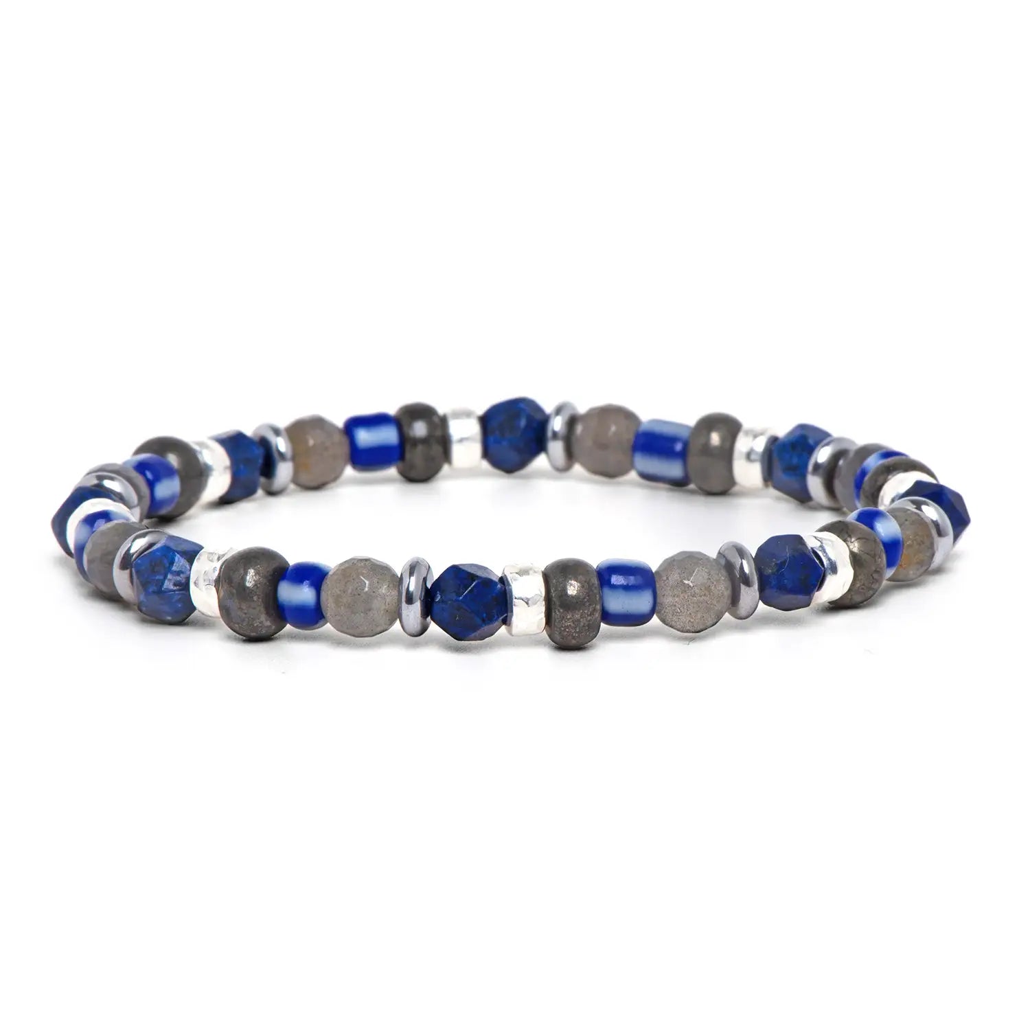 Mystone is a men's bracelet handmade in Italy with natural stones, a dynamic and refined accessory designed for those who love a modern and polished style. The combination of intense lapis lazuli, shiny hematite, iridescent labradorite, mineral-charming pyrite, and blue ethnic glass creates an original balance of colors and reflections. Each stone is carefully selected and crafted with Made in Italy artistry, enhancing quality and personality.