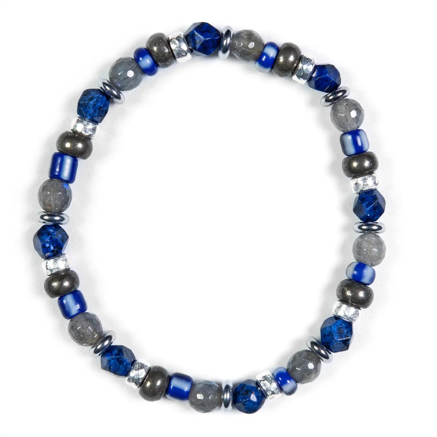 - Stones: Dark gray pyrite with 4 mm rondelle cut, blue lapis lazuli with 4 mm pebble cut, labradorite beads with 4 mm faceted cut, 4 mm silver hematite rondelles, and 4 mm rondelle-cut ethnic glass;