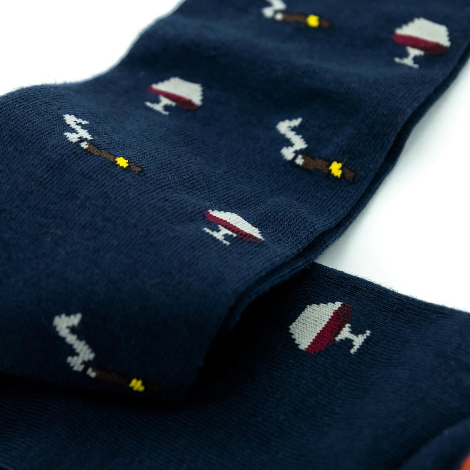 Original and classy cotton sock with a dark orange cuff and wine and cigars pattern, comfortable and durable, to face life with courage and passion