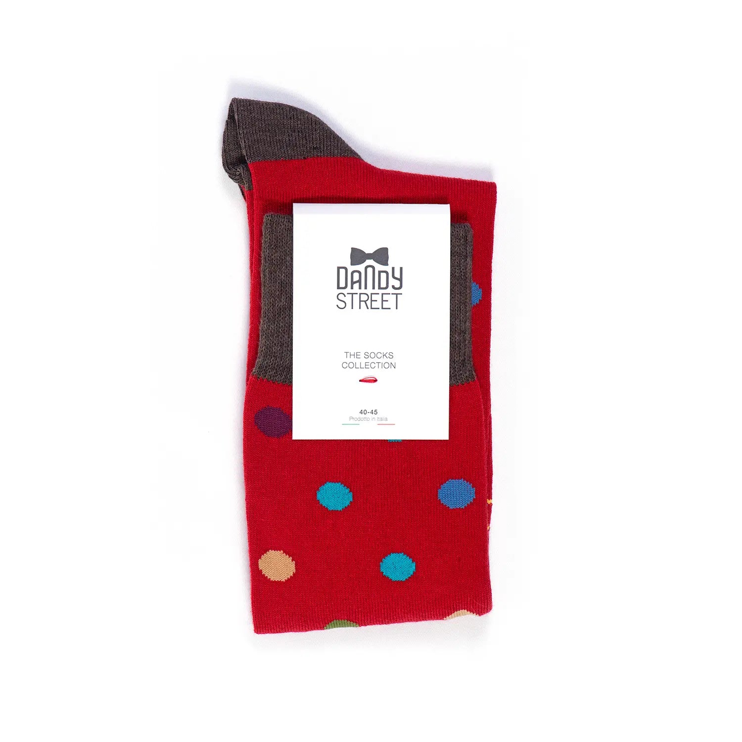 Discover our men's cotton socks, featuring a refined polka dot pattern: these accessories are not only elegant but also a quality choice for those seeking socks with character. Made from fine cotton, these socks showcase a colorful polka dot design on a red background, with cuff, toe, and heel in a distinctive brown.