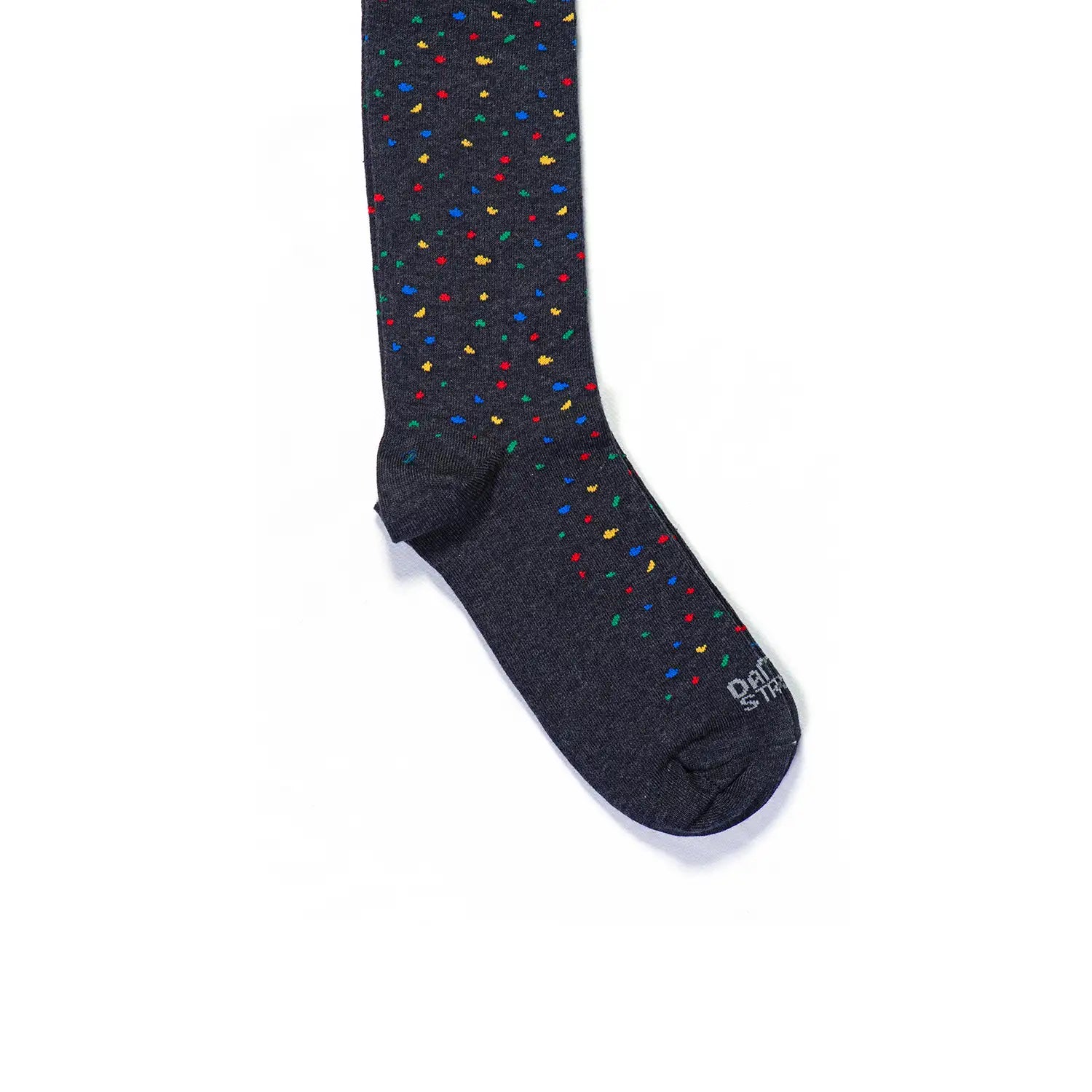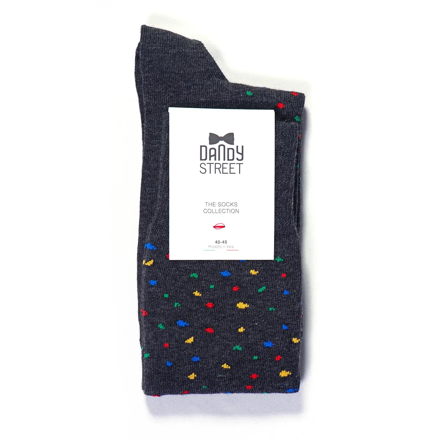 Men's black cotton socks with a confetti pattern are an accessory that cannot be missing in a modern wardrobe: made in classic black, they are enriched with small colored dots that add a touch of originality and sophistication. Ideal for those who love to stand out with unique details, these socks are perfect for adding personality to both casual and more formal looks.