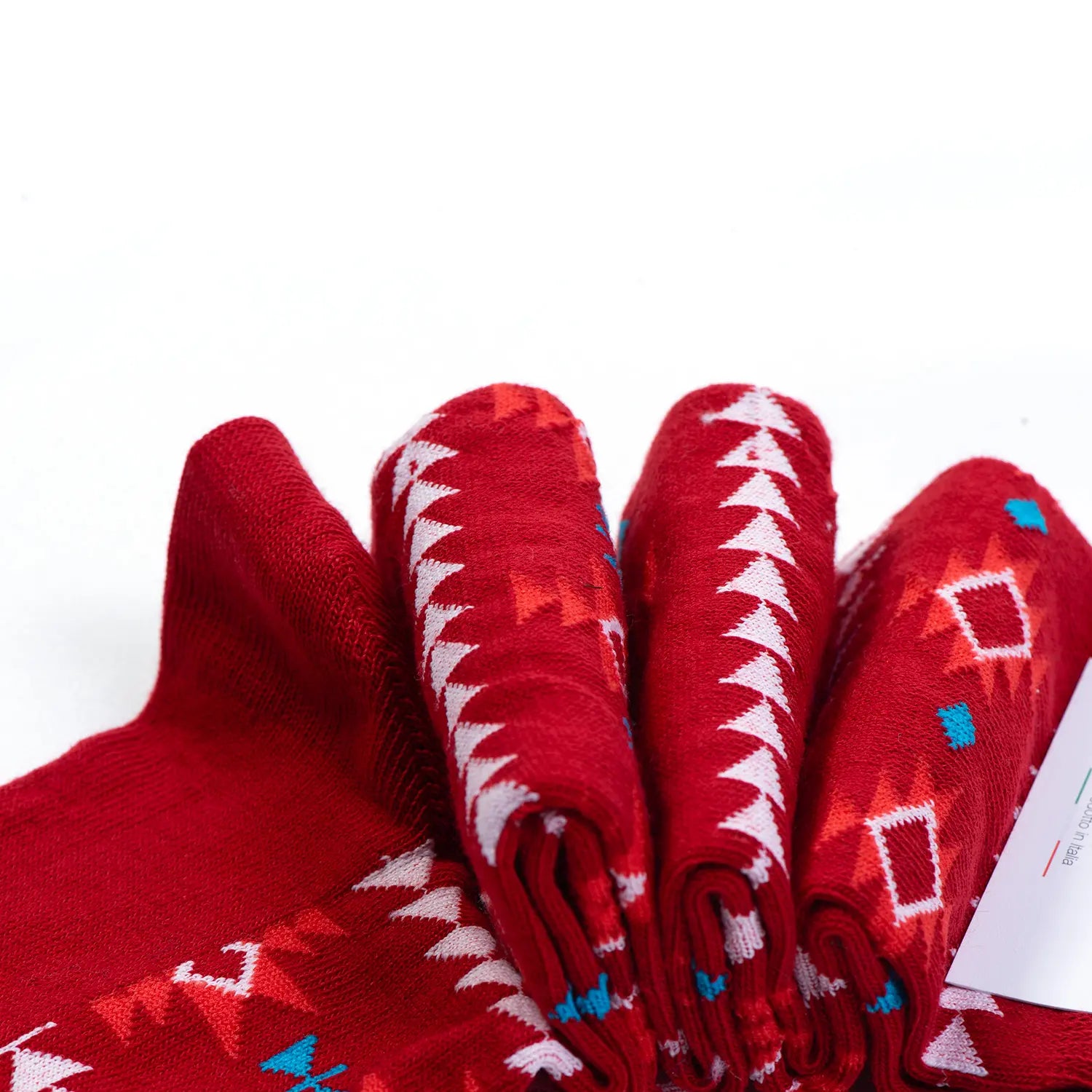 These men's cotton socks, adorned with charming geometric Navajo-style patterns, are a must-have accessory for those who want to express their style in an original way. Made from soft cotton, they feature an eye-catching design that plays with vibrant colors like red, white, and light blue on a deep red background. The intricate Navajo patterns give these socks a unique and distinctive character, perfect for those who want to express their personality through the details of their outfit.