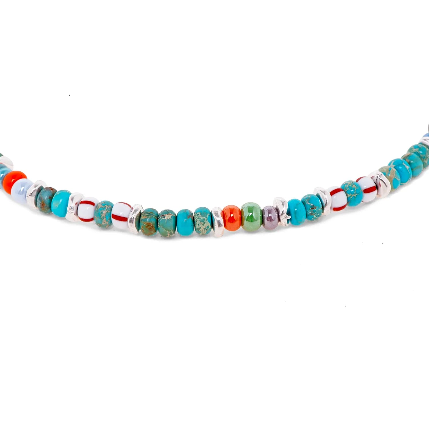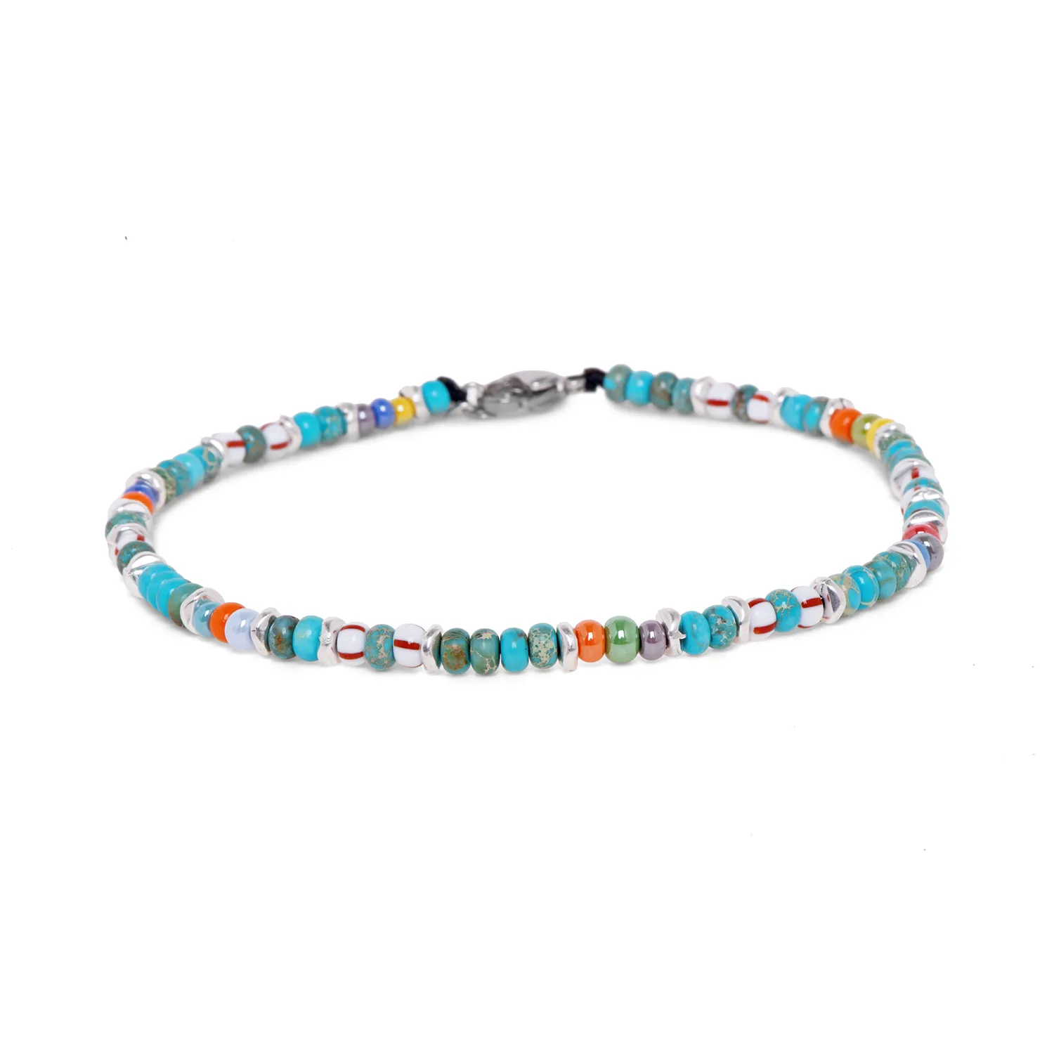 Ketyl is an exclusive and seductive men's anklet handmade in Italy, an accessory that captivates with its refined originality and modern elegance. The harmonious alternation of vibrant turquoise imperial jasper and multicolored ethnic glass beads creates an explosion of style and charm.