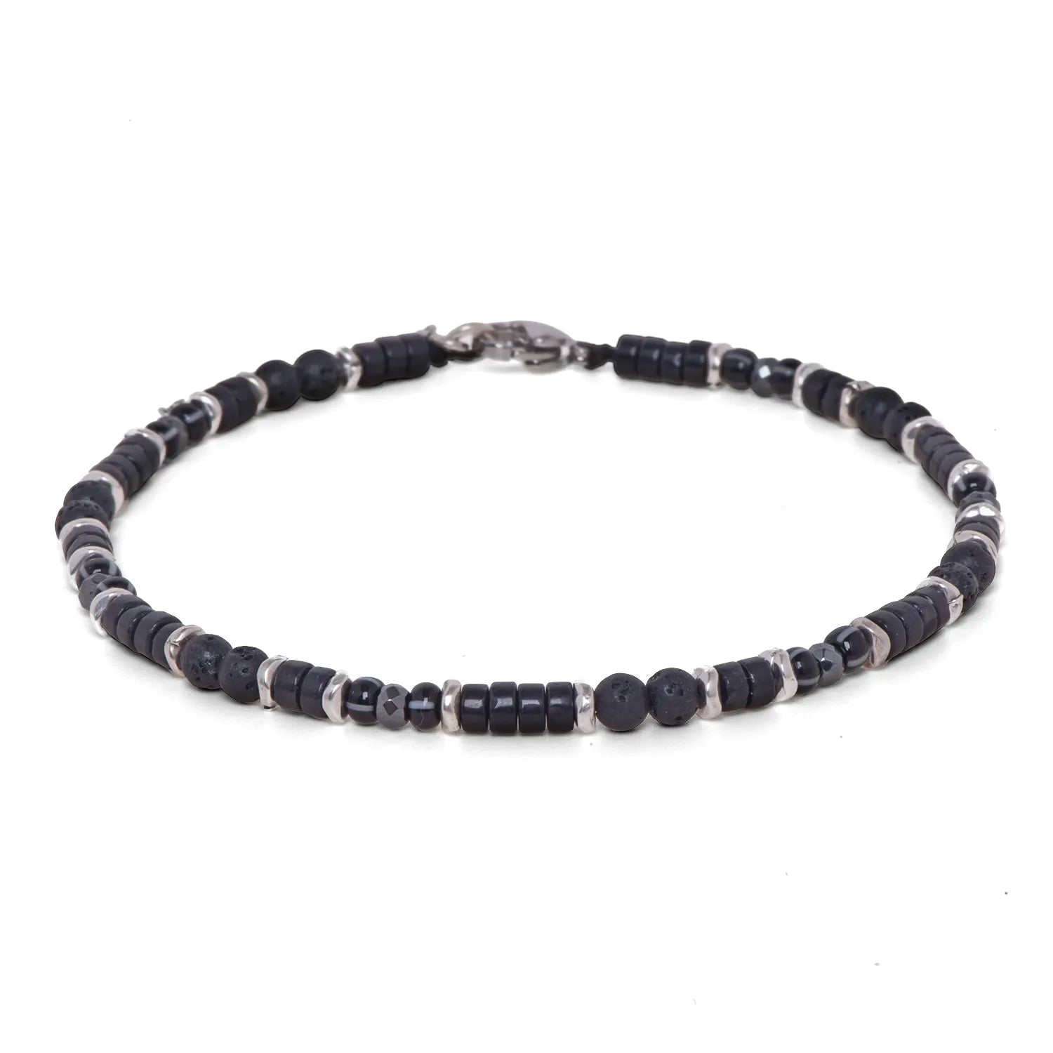 Hogas is a men's anklet handmade in Italy, a bold and distinctive accessory that captivates with its originality and modern elegance. The perfect balance between the powerful lava stone and the other dark stones creates a unique and timeless charm.