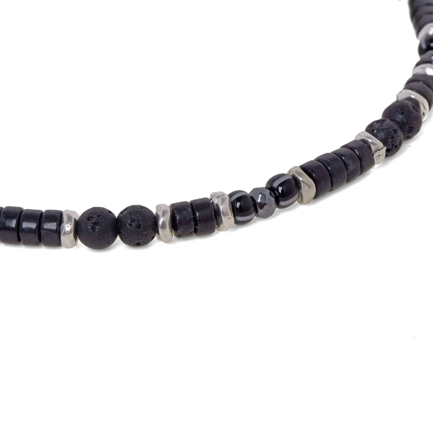 - Stones: Lava stone beads, gray faceted hematite with rondelle cut, black ethnic glass beads with matte white stripes, and matte onyx rondelles