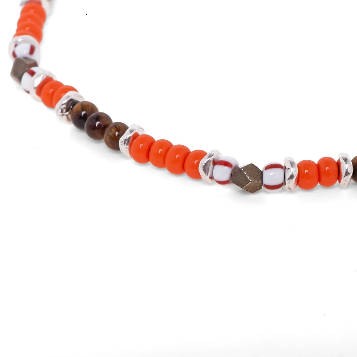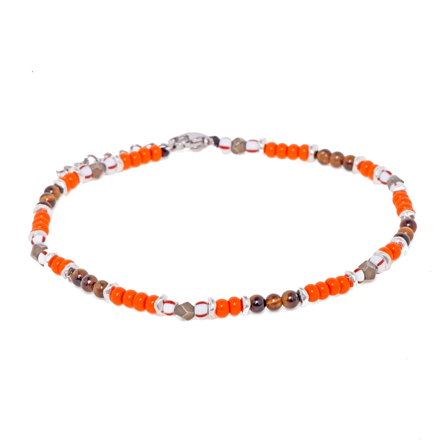 Symphos is a men's anklet handmade in Italy, an exclusive and intriguing accessory that stands out for its refined originality and contemporary elegance. With a harmonious blend of tiger's eye, orange ethnic glass beads, and sparkling pyrite, this creation exudes a captivating and unique charm.
