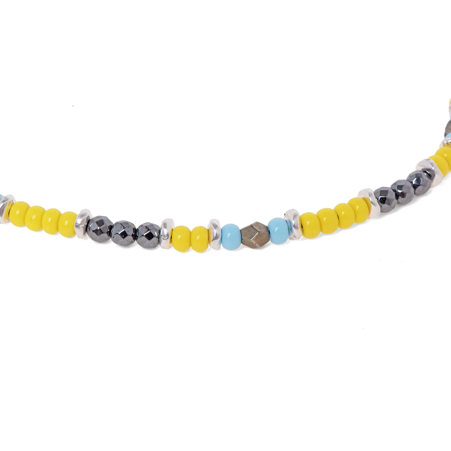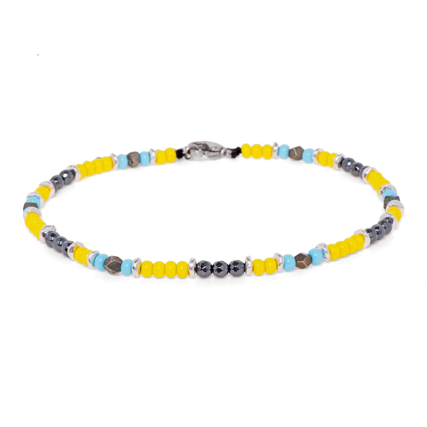 Valys is a men's anklet with natural stones, handmade in Italy, a sophisticated and contemporary accessory that captivates with its uniqueness and refinement. Combining shiny gray hematite with bright pyrite and vibrant yellow ethnic glass beads, this creation expresses a perfect balance between elegance and boldness.