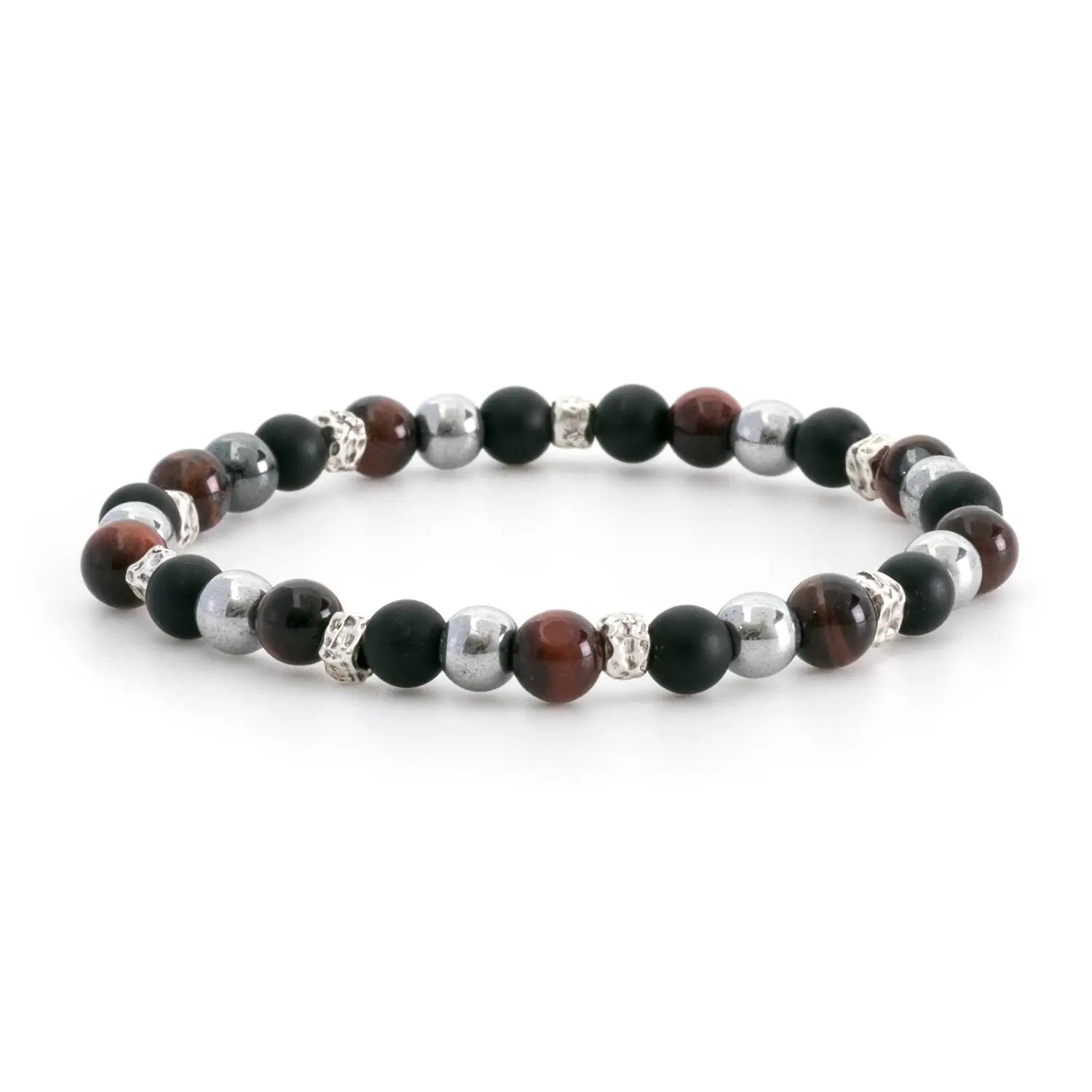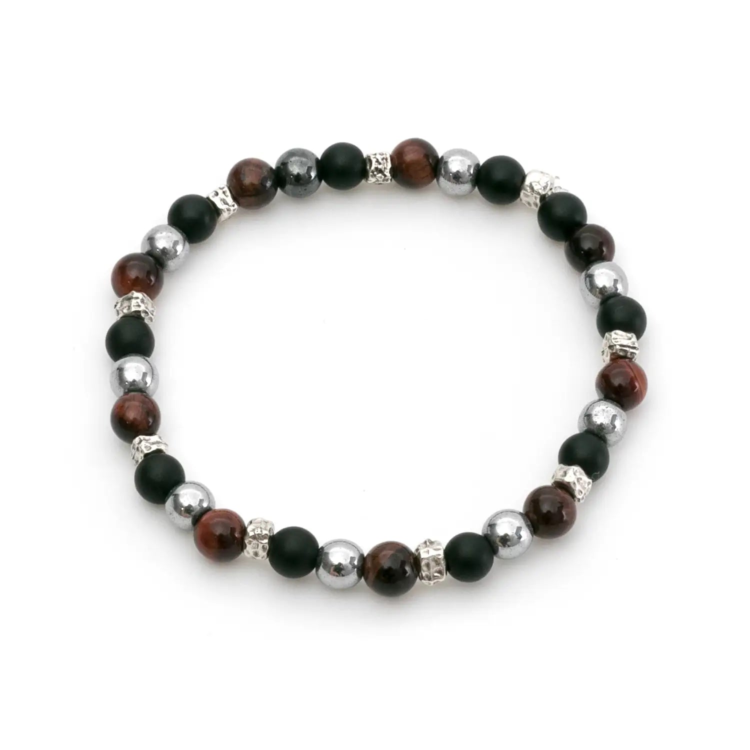 - Stones: 6 mm brown tiger's eye beads, 6 mm silver hematite beads, 6 mm matte onyx beads