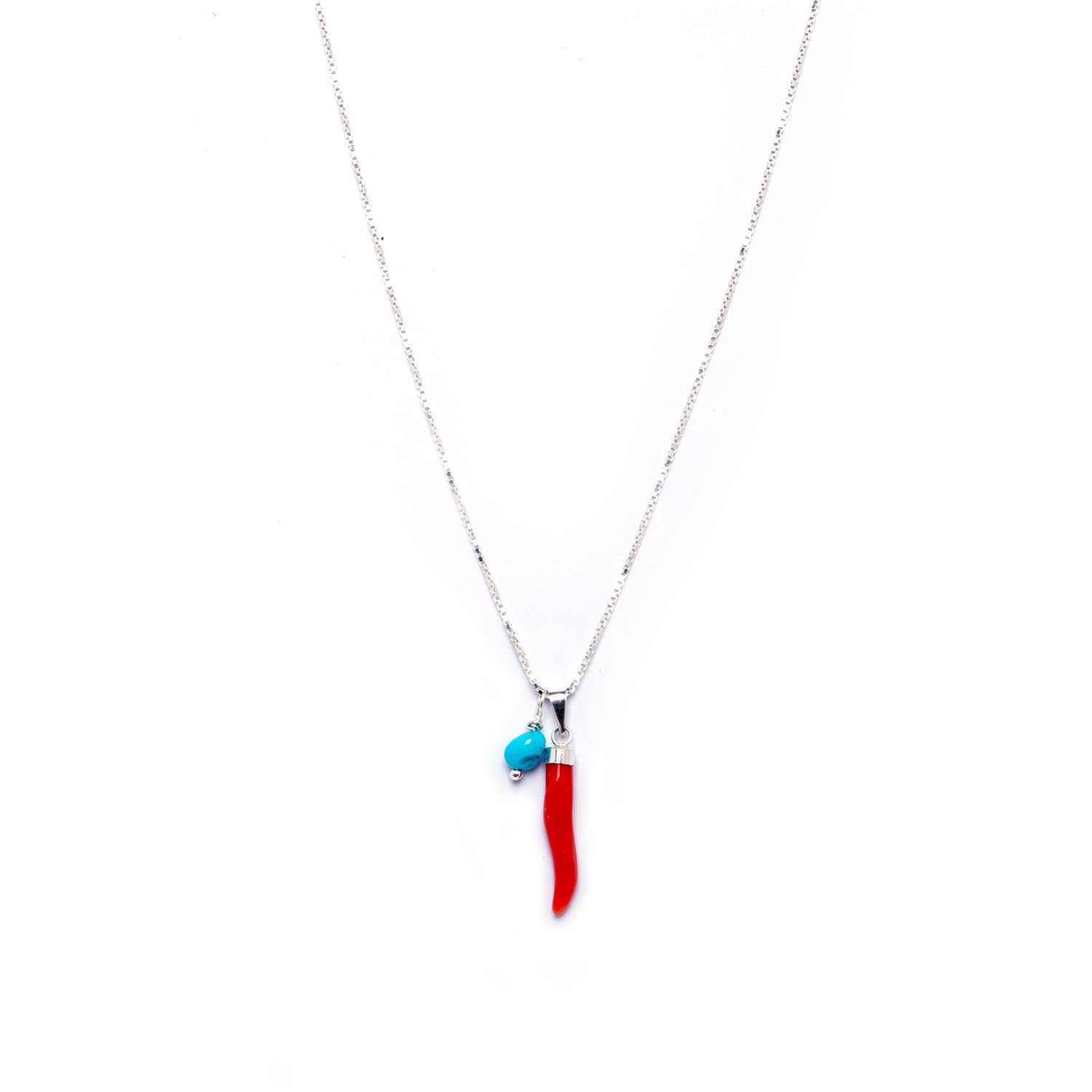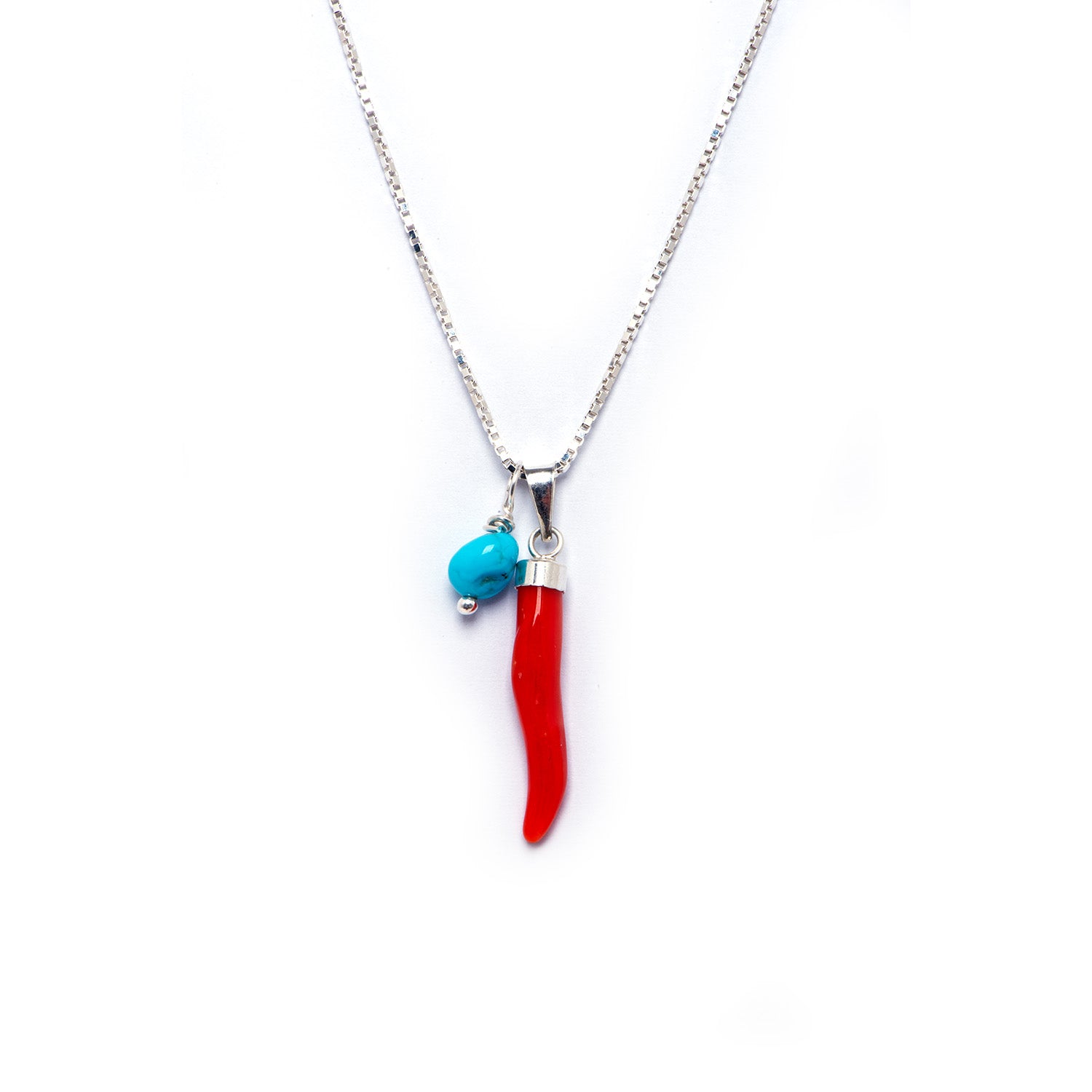 The 925 silver Venetian chain is lightweight and durable, ideal for those seeking an accessory that combines elegance and character. The two pendants, a vibrant turquoise stone and a red coral pendant shaped like a curved horn, add a touch of color and meaning, perfect for those who want to tell a story through details.