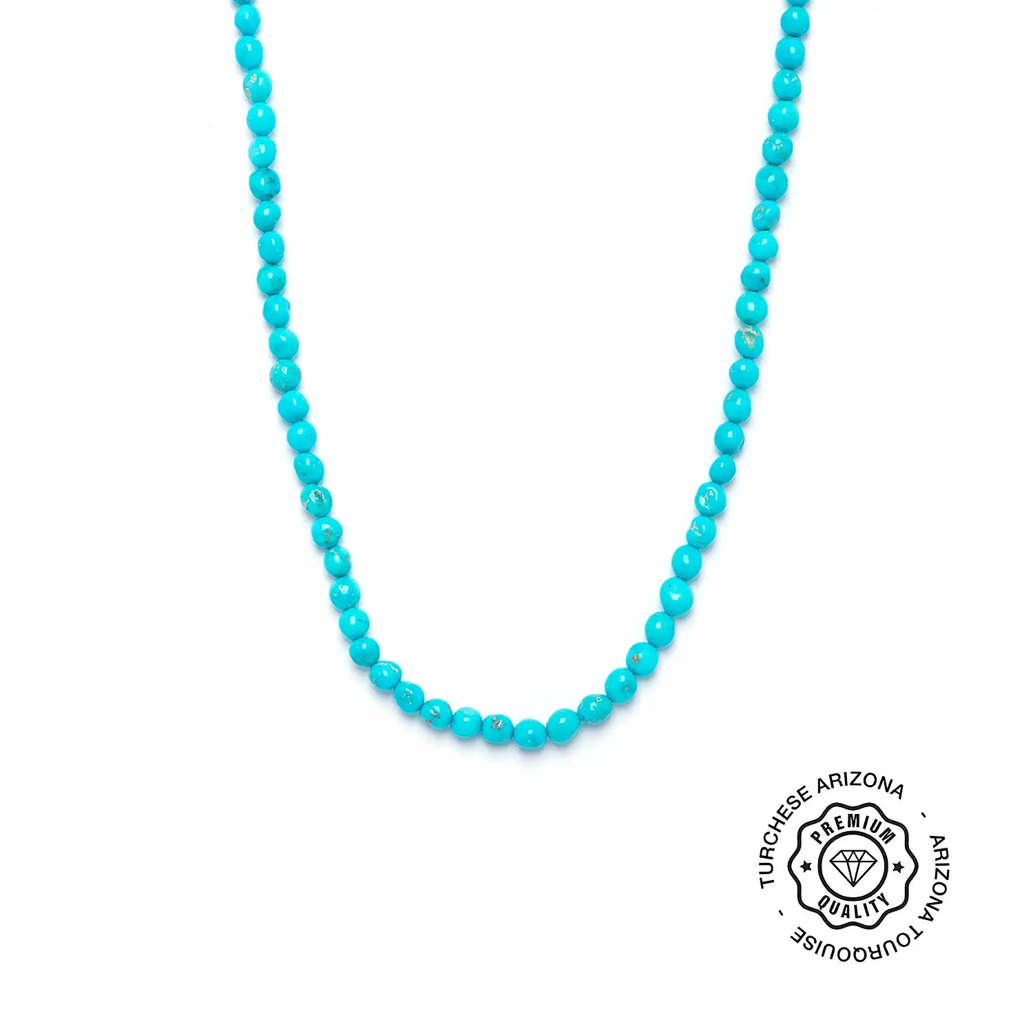 It is a unique gem, appreciated for its vibrant blue-green color, ranging from sky blue to forest green depending on the amount of copper and other minerals present in the stone. This turquoise is known for its matte and waxy texture, due to the presence of a serpentine mineral, often found in conjunction with turquoise deposits. Beyond its extraordinary beauty, the Arizona turquoise in our men's necklace is highly sought after for its rarity. This precious stone is found only in a few specific locations in the state of Arizona, making it a treasure coveted by collectors and enthusiasts.