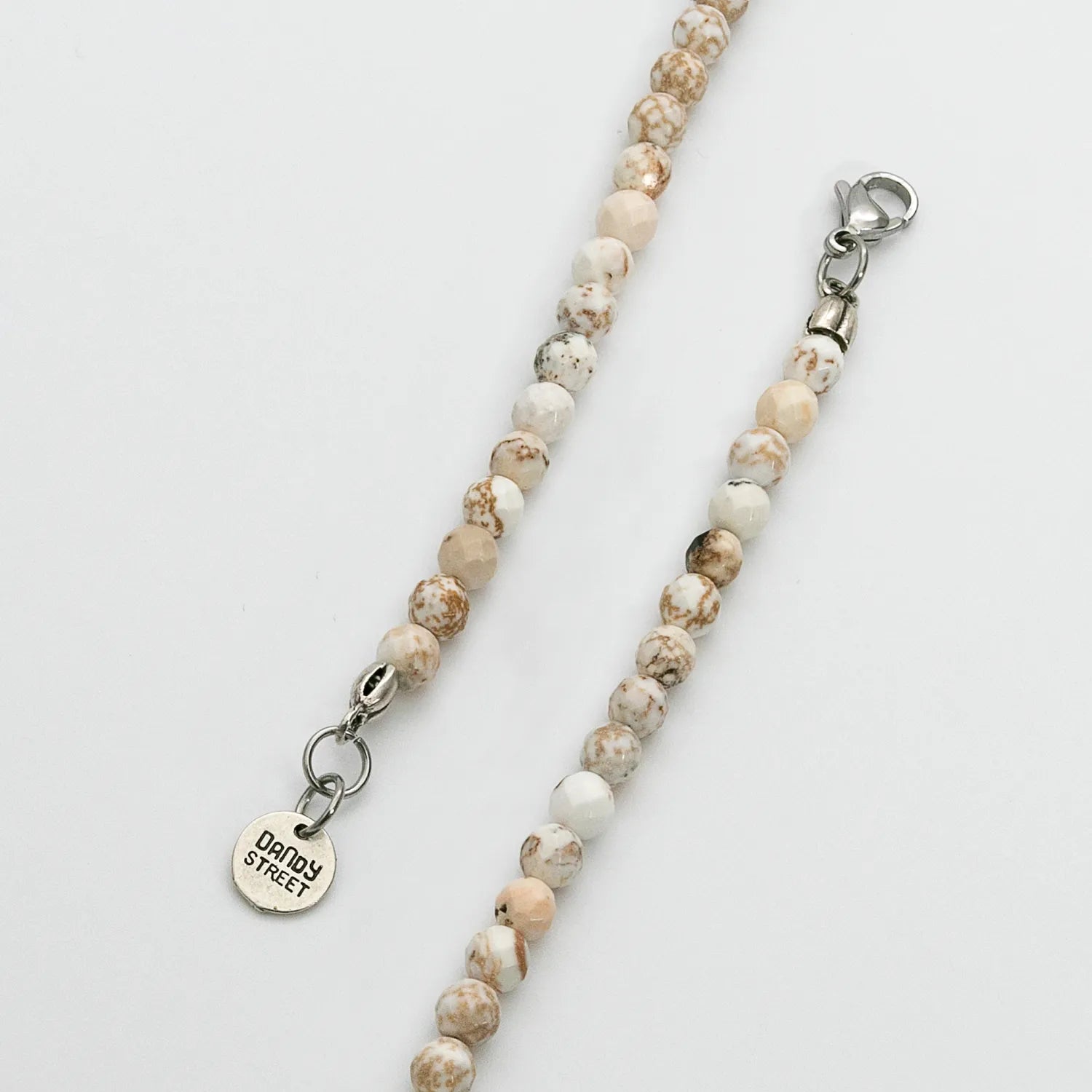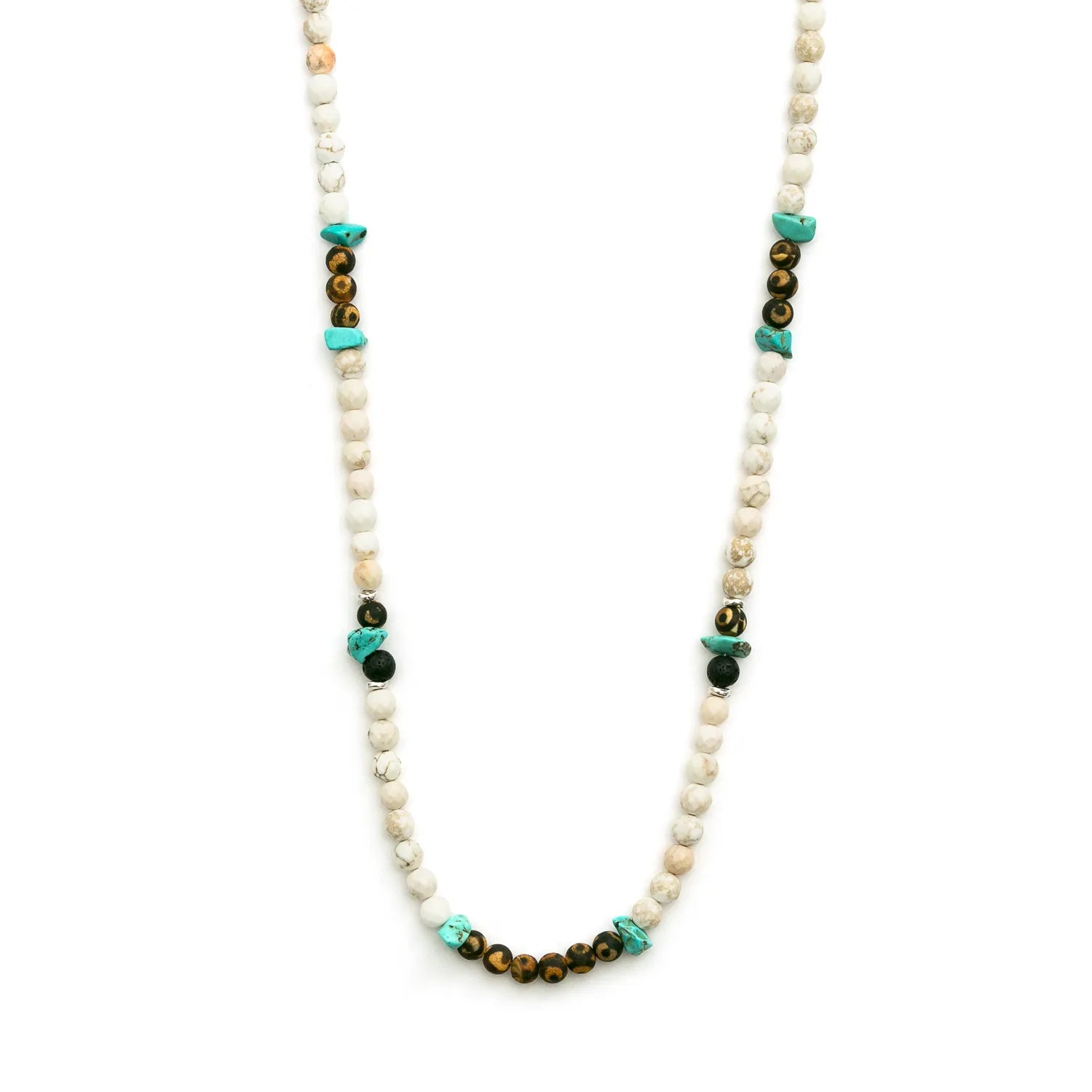 - Stones: White aulite beads, 4mm ethnic agate beads, 6mm lava stone beads, and turquoise aulite chips