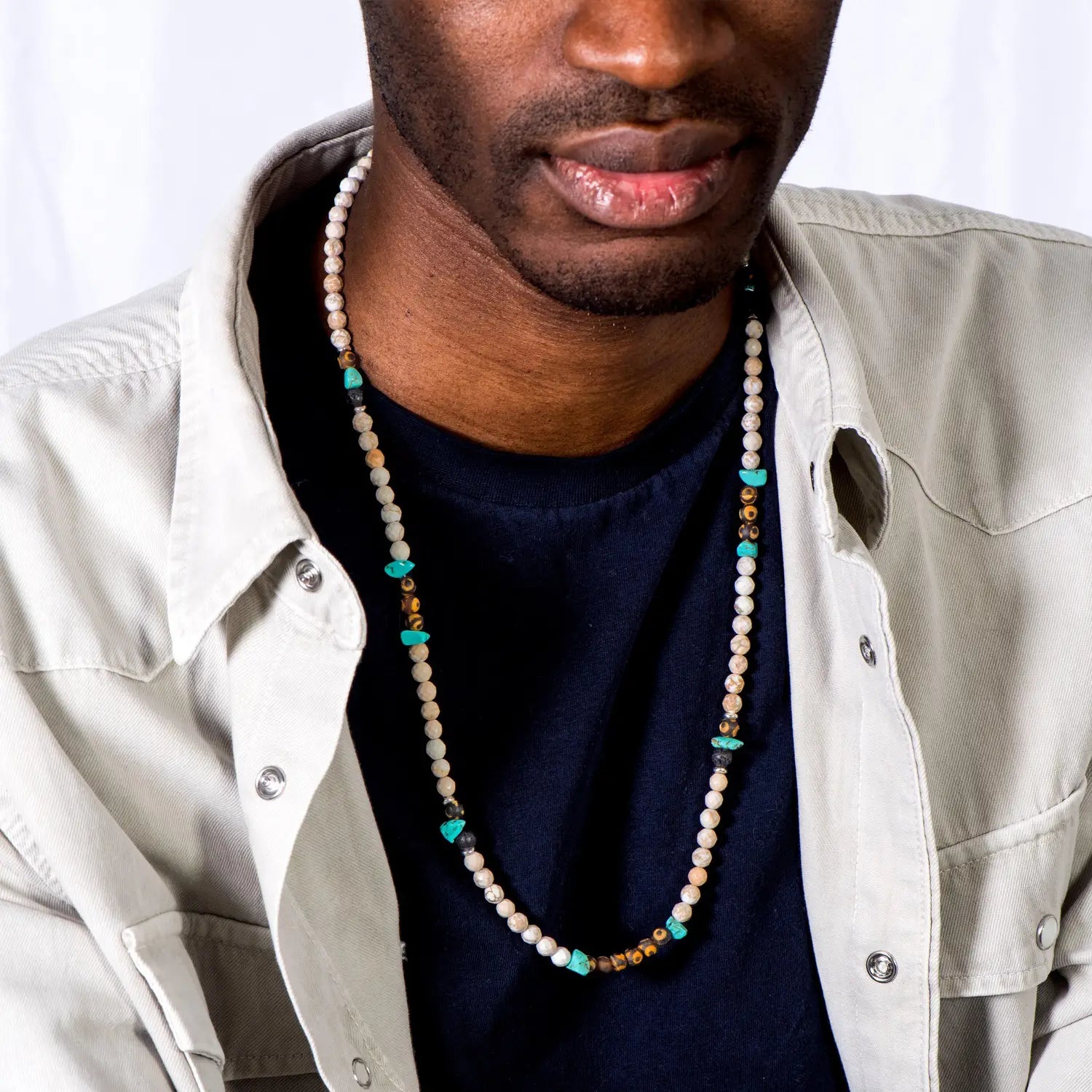 Tupai is a men's necklace handmade in Italy with natural stones, a work of art that blends artisanal tradition with bold modernity: the white aulite beads embody mental clarity and awareness, while the ethnic agate beads represent inner strength and protection. Finally, complement your style with the intrinsic energy of lava stone, a symbol of passion and determination.