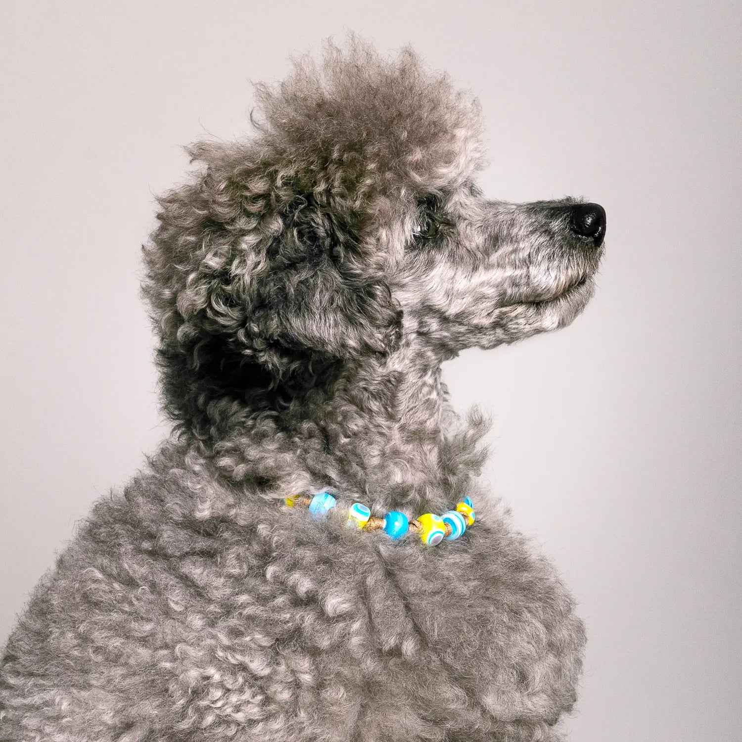 - Materials: The collar structure is made of waxed cotton cord; the collar is crafted with 11mm yellow and blue Murano glass beads