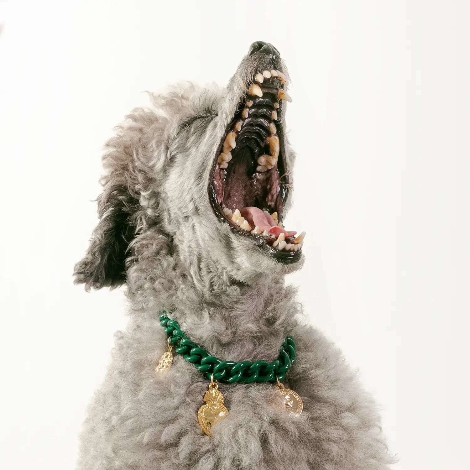 - Materials: Green enameled aluminum chain with a diameter of 13mm; the collar is made with various types of golden steel tags shaped like a lion, heart, and coin
