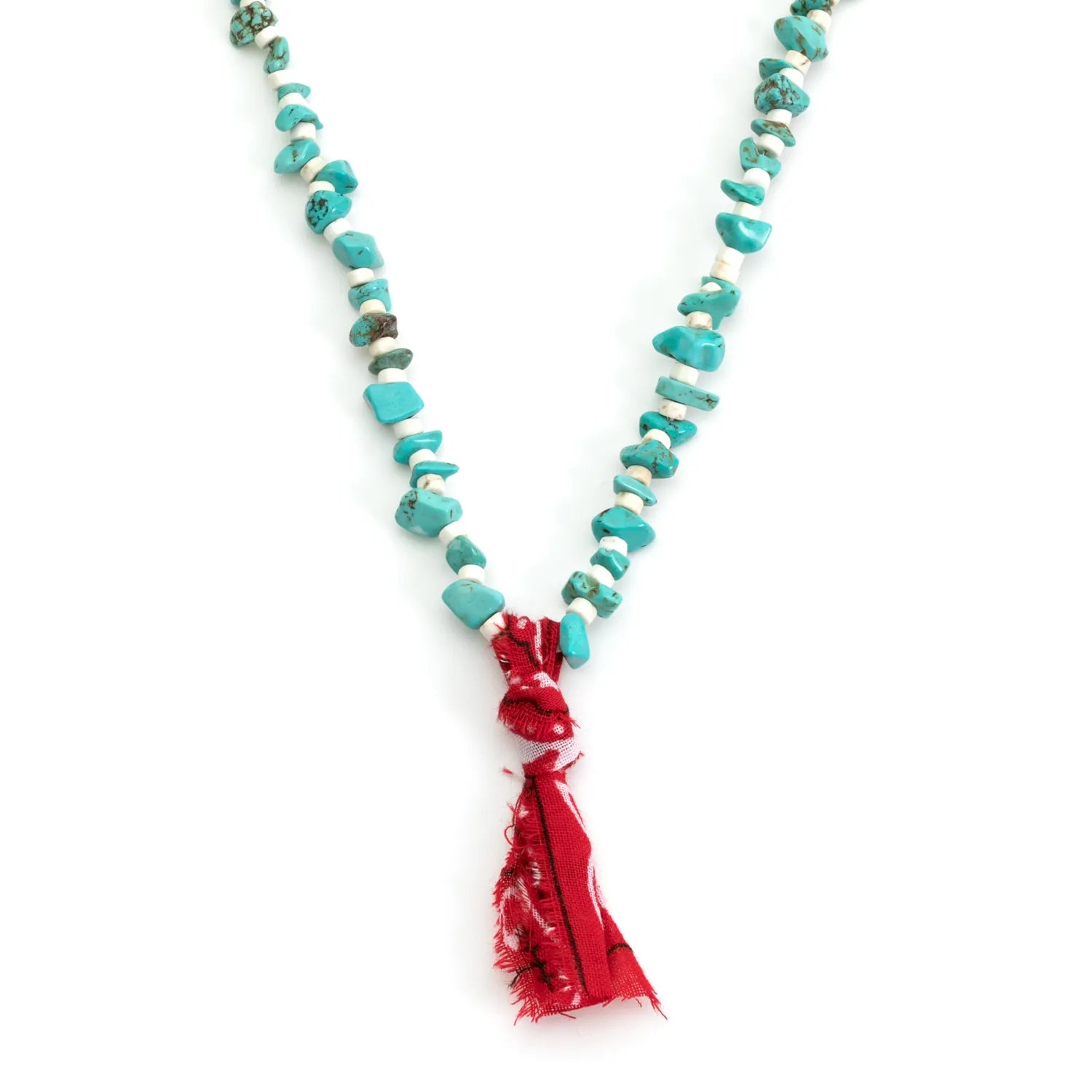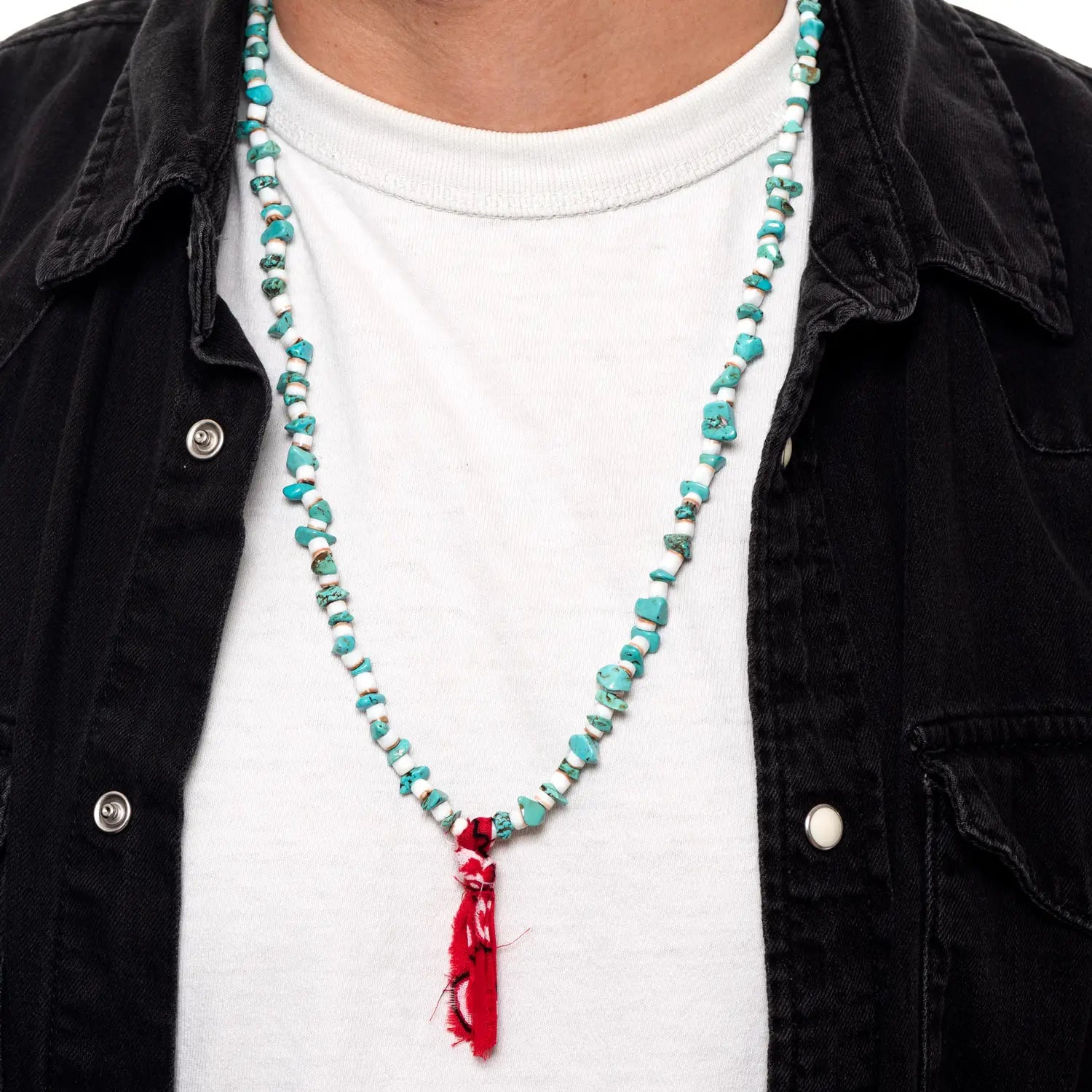 Carlom, a men's necklace handmade in Italy with natural stones, is the perfect accessory to complete your summer look: made of irregularly cut turquoise aulite, shell, and an original cotton bandana tassel as a pendant, this necklace will make you feel on vacation even in the city.