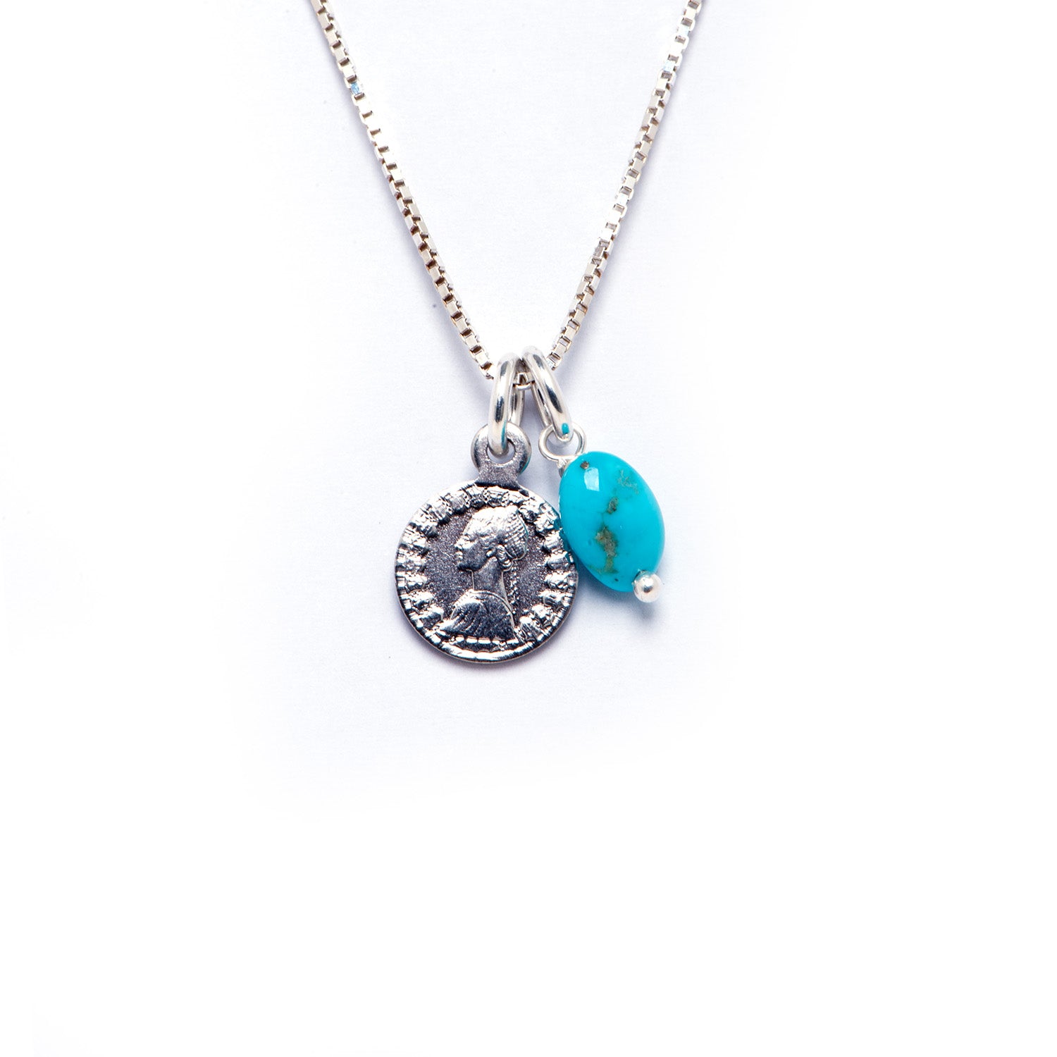 • Pendants: Turquoise stone with a rough cut and 925 silver coin with high relief detailing