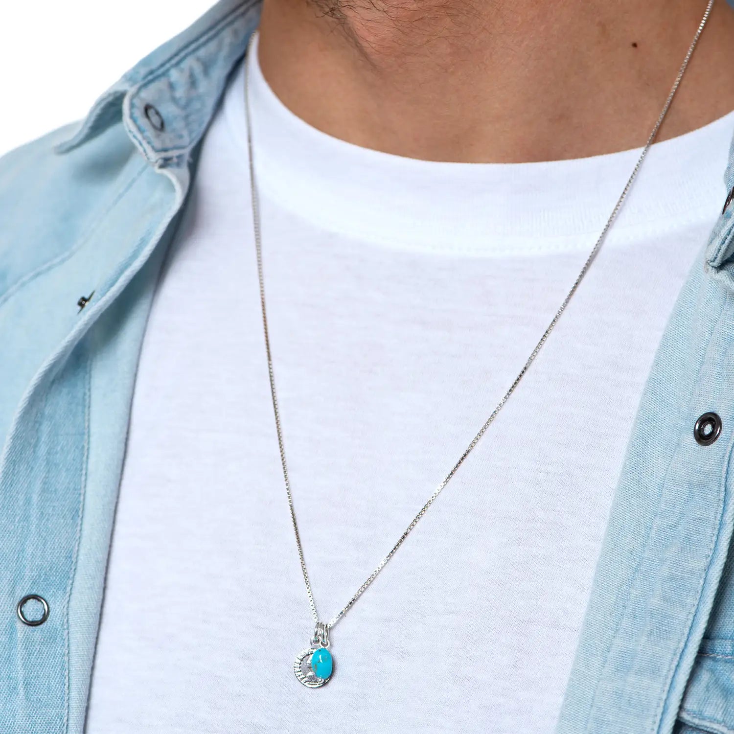 The 925 silver Venetian chain is elegant and durable, ideal for those seeking an accessory that combines quality and style. The two pendants, an antique-looking coin and a turquoise stone with an intense color, create a fascinating contrast, adding a touch of originality to every outfit.
