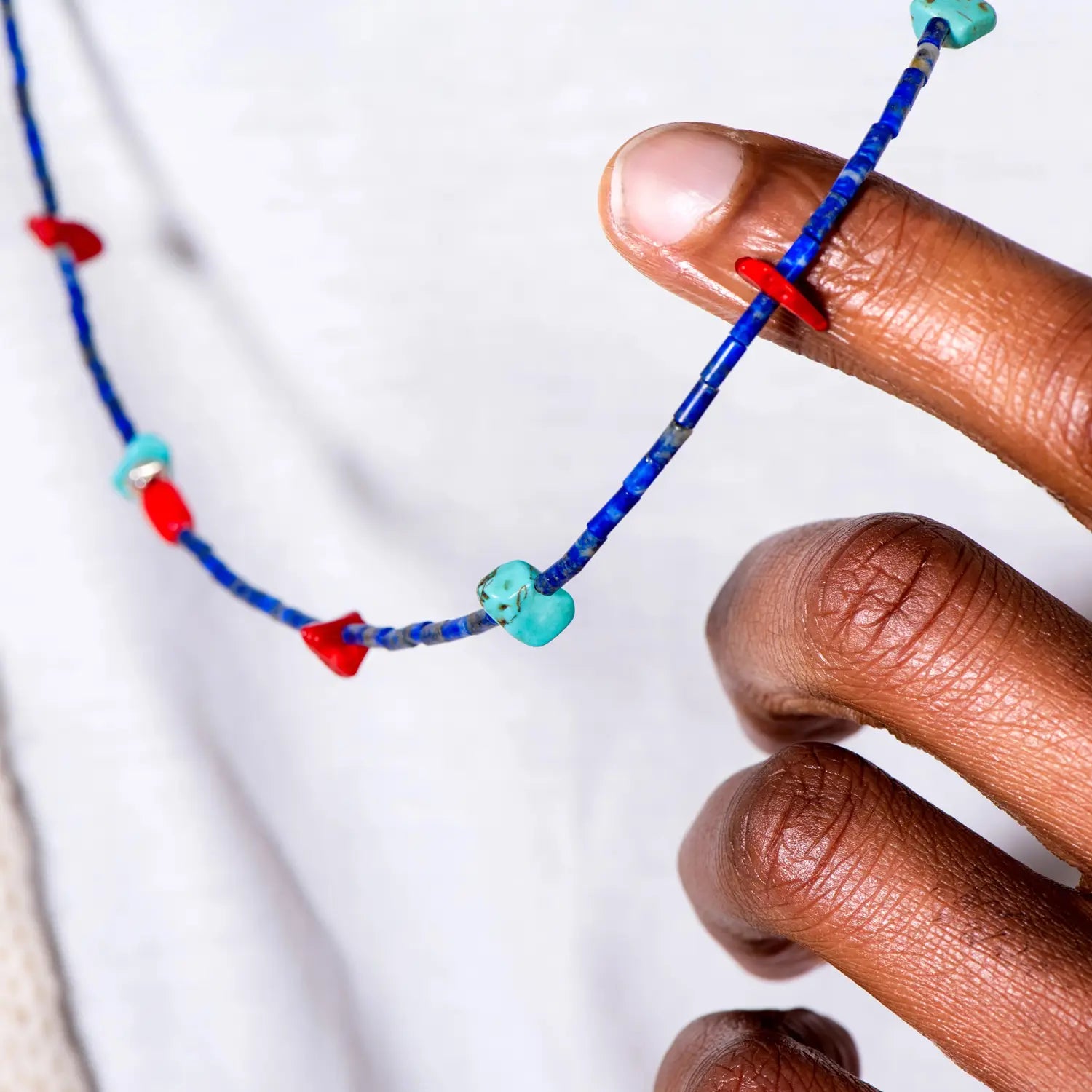 Lapis lazuli, a symbol of inner peace and awareness, combines with turquoise aulite, a bearer of balance and harmony, making this accessory perfect to complete any outfit with a touch of style and mystery.