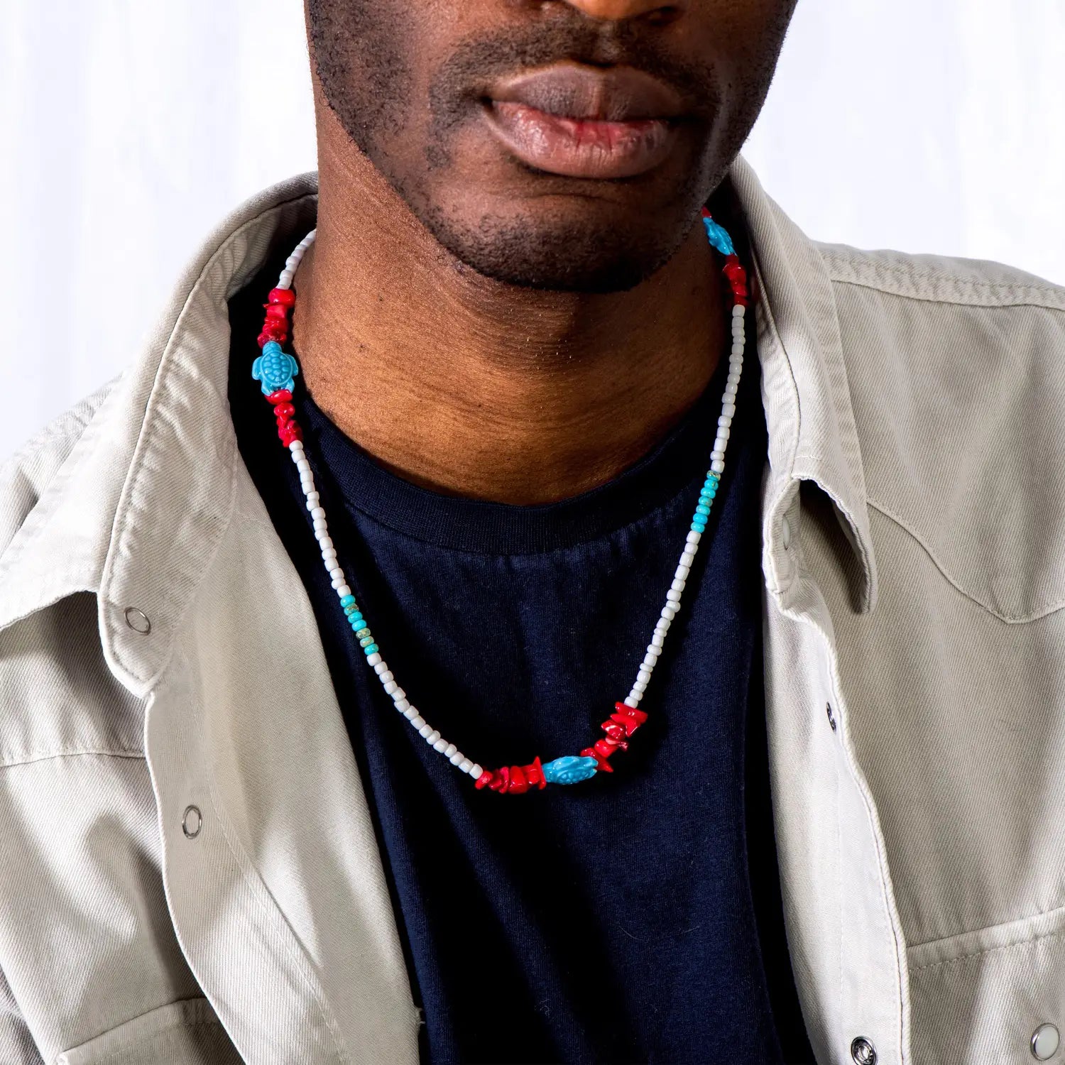 Yalas is a men's necklace handmade in Italy, a masterpiece of elegance and artisanal contemporary style: its white ethnic glass beads, combined with imperial jasper and bamboo coral, symbolize inner strength and vitality.