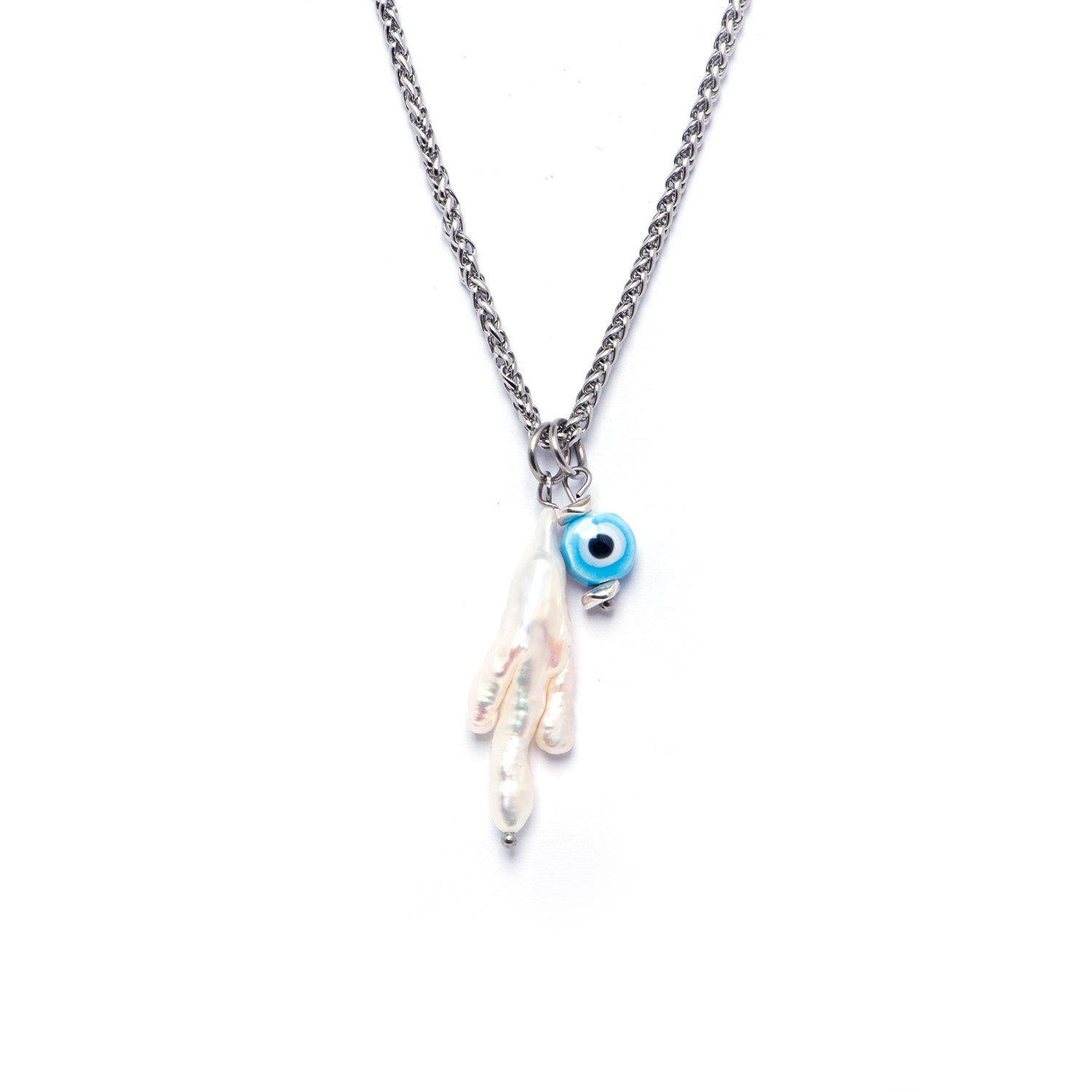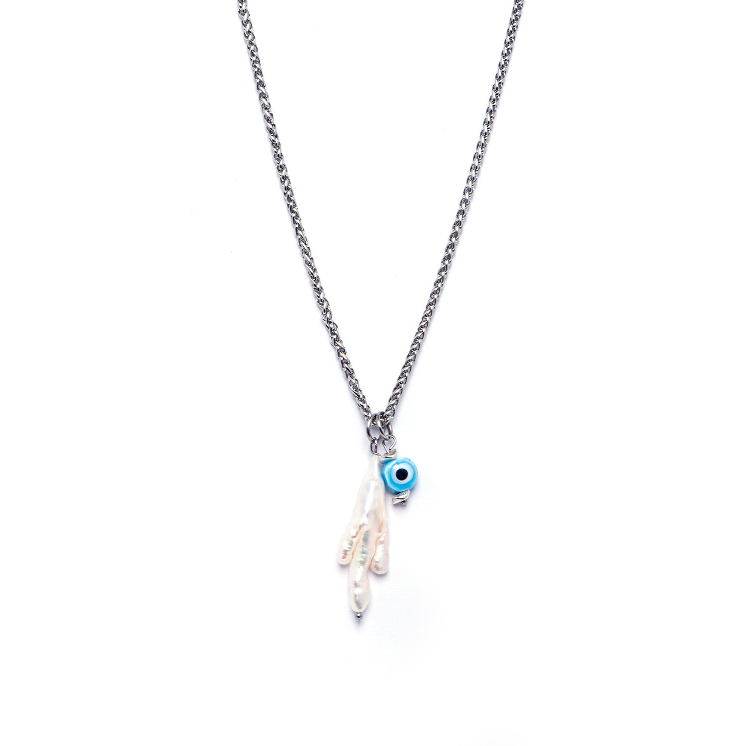 The wheat chain made of hypoallergenic steel is sturdy and comfortable, ideal for those looking for an accessory that can accompany casual or more refined looks. The two pendants, a Greek eye in ceramic, symbolizing protection and positivity, and a naturally shaped freshwater pearl, add a touch of authenticity and meaning, making this necklace perfect for those who love to tell a story through details.