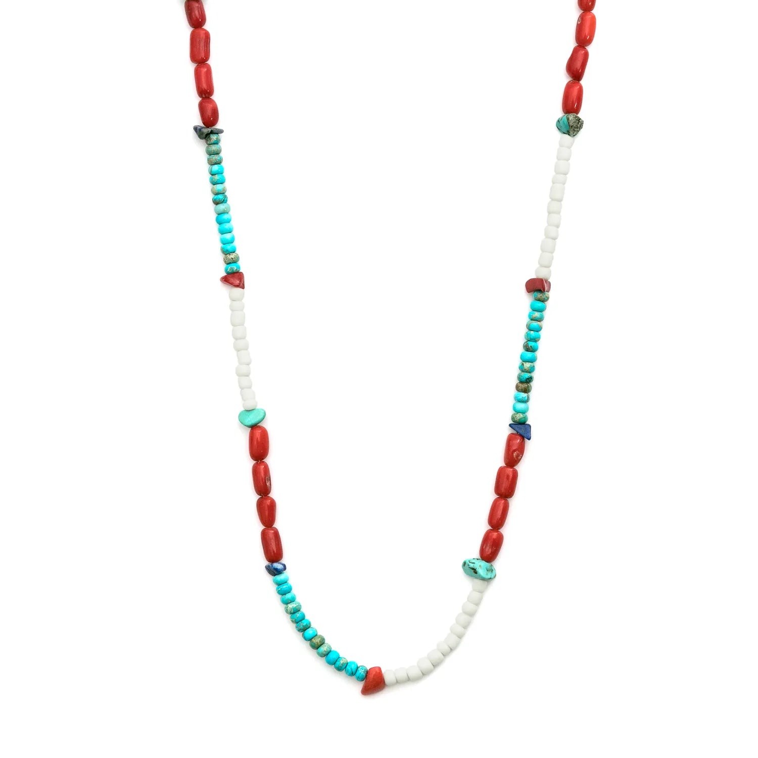 Oks is a men's necklace handmade in Italy, a symbol of elegance and artisanal style: with natural turquoise aulite stones, ethnic glass, and bamboo coral arranged symmetrically, Oks conveys a unique energy of balance and vitality.