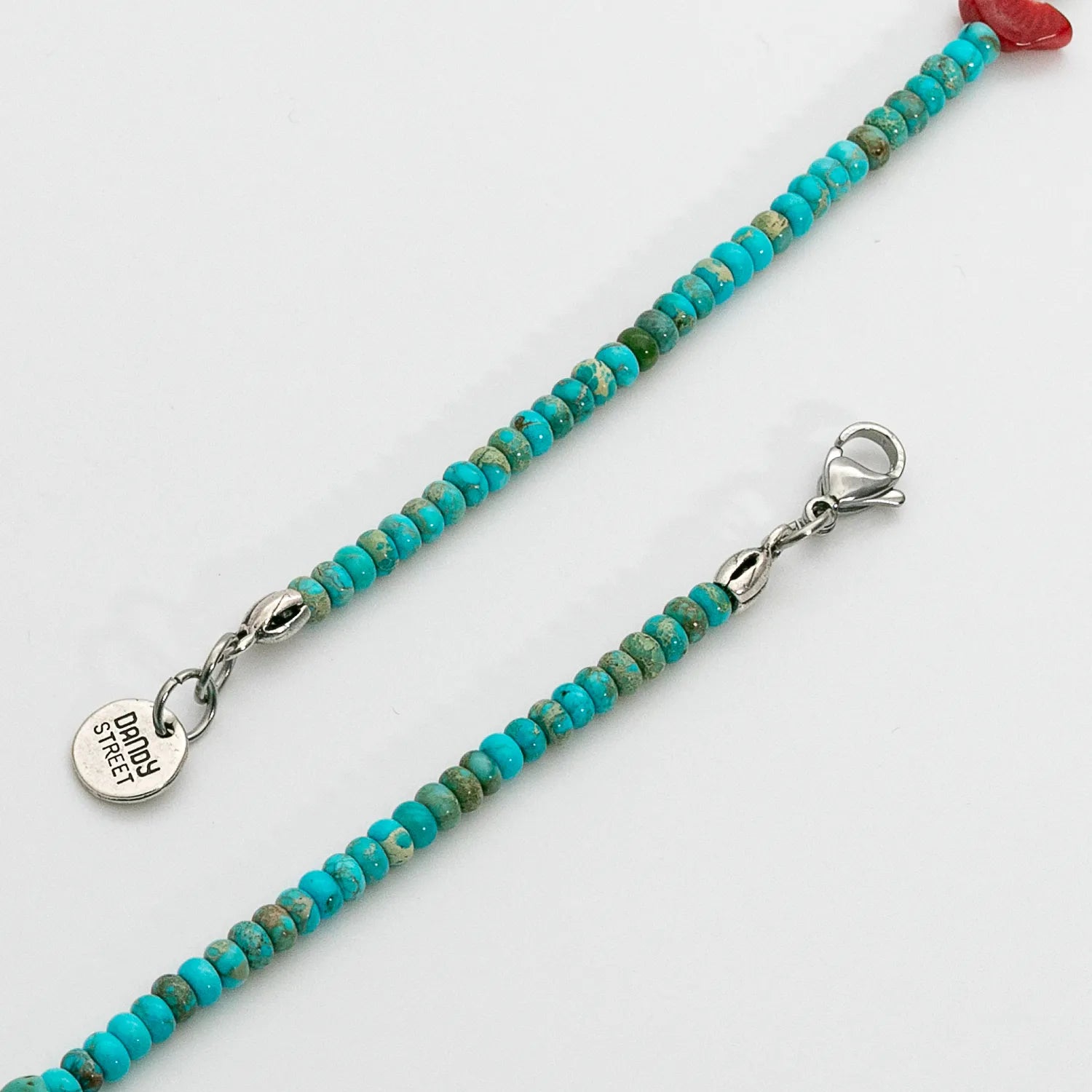 Turquoise aulite, a symbol of wisdom and protection, combines with bamboo coral, a bearer of strength, transforming this necklace into the perfect accessory for any occasion, adding a touch of personality and originality to your look.