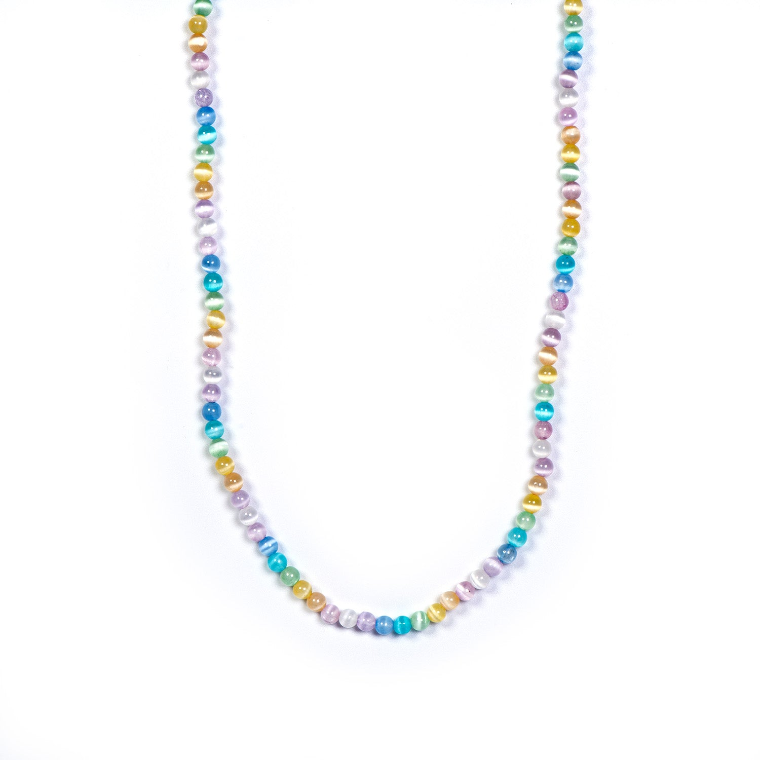 Entirely made of colored selenite stones, it features a harmonious sequence of pastel shades that evoke lightness, positivity, and creative energy. Each stone is unique and helps create an elegant yet never excessive color play, ideal for those who want to stand out with taste.
