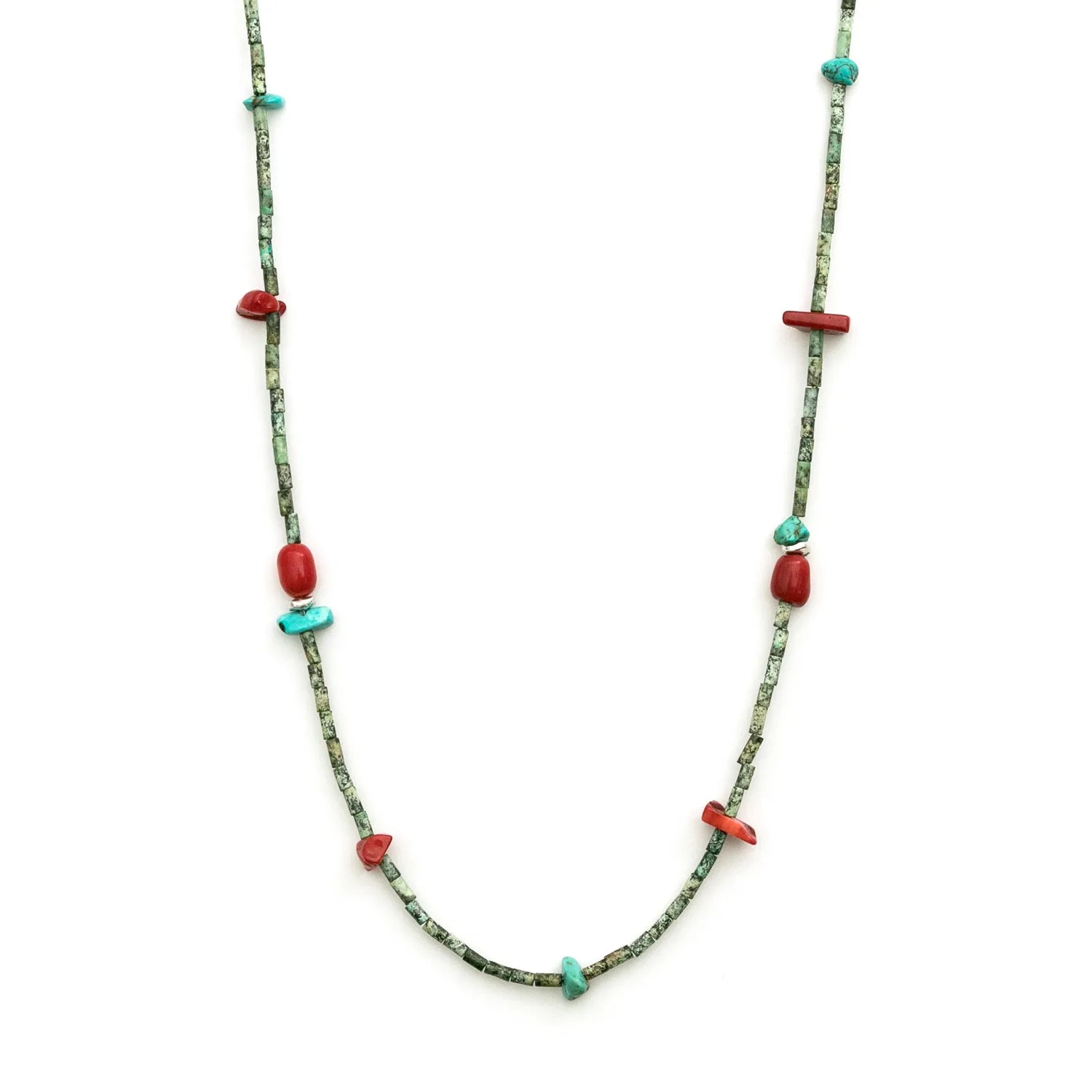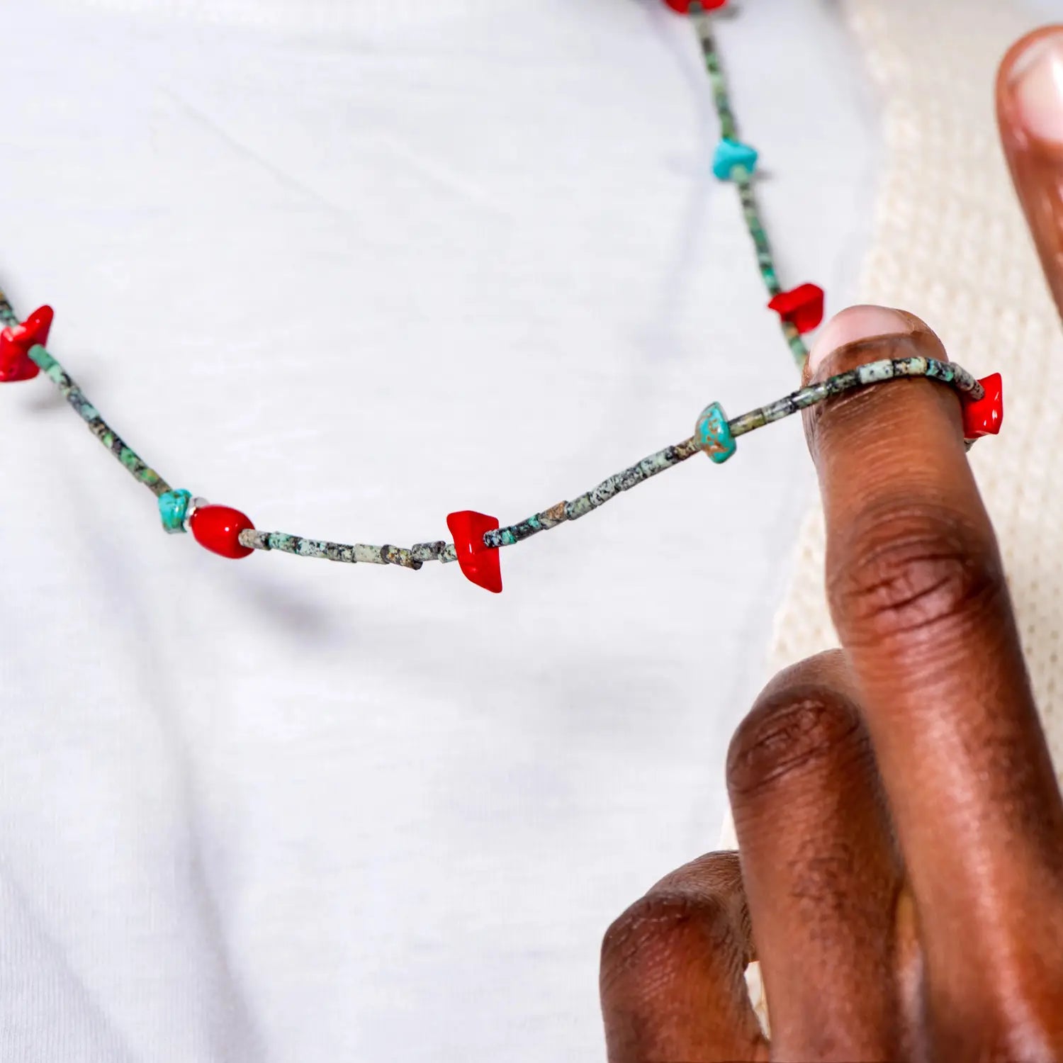 - Stones: 3mm African turquoise tube beads, turquoise aulite chips, and bamboo coral with various cuts