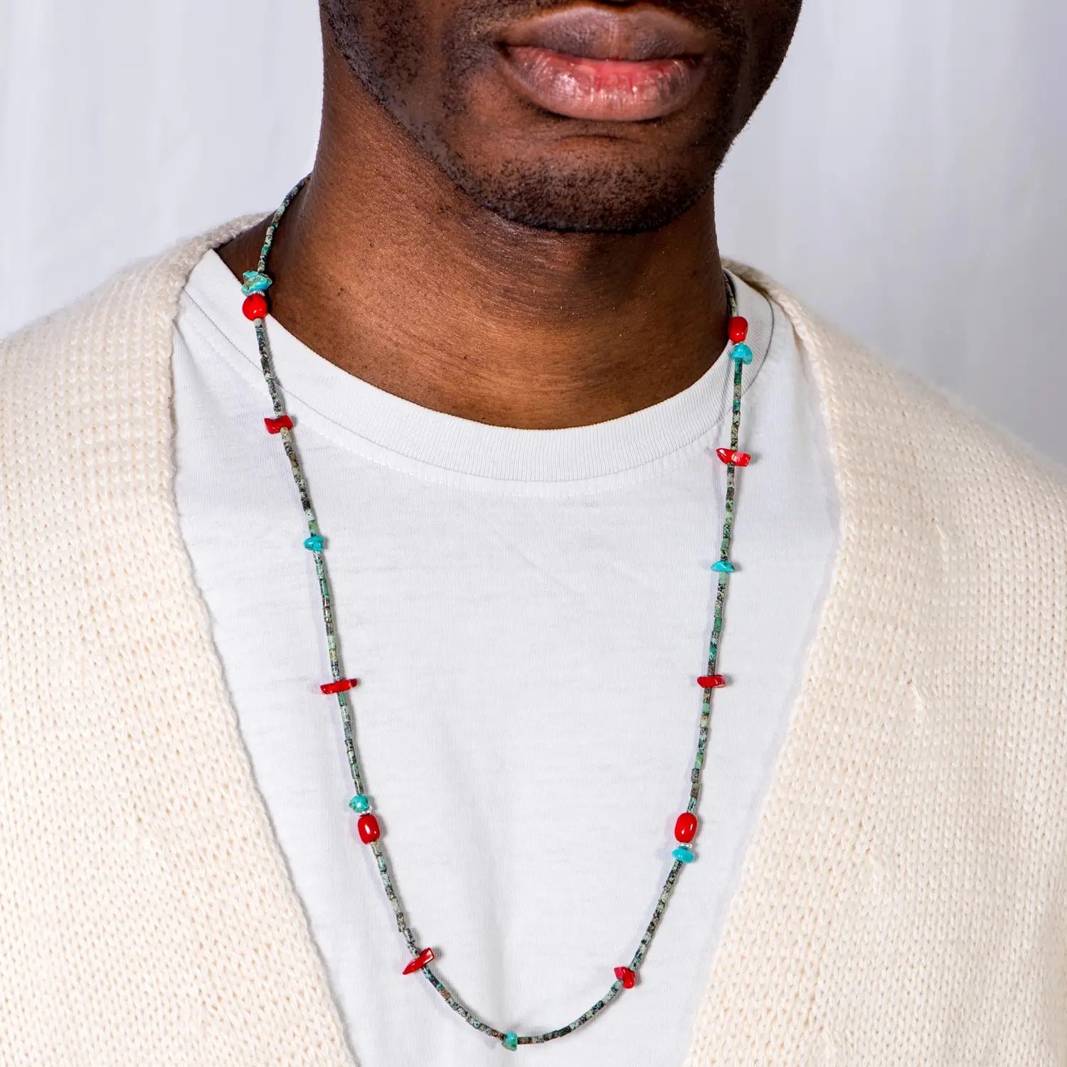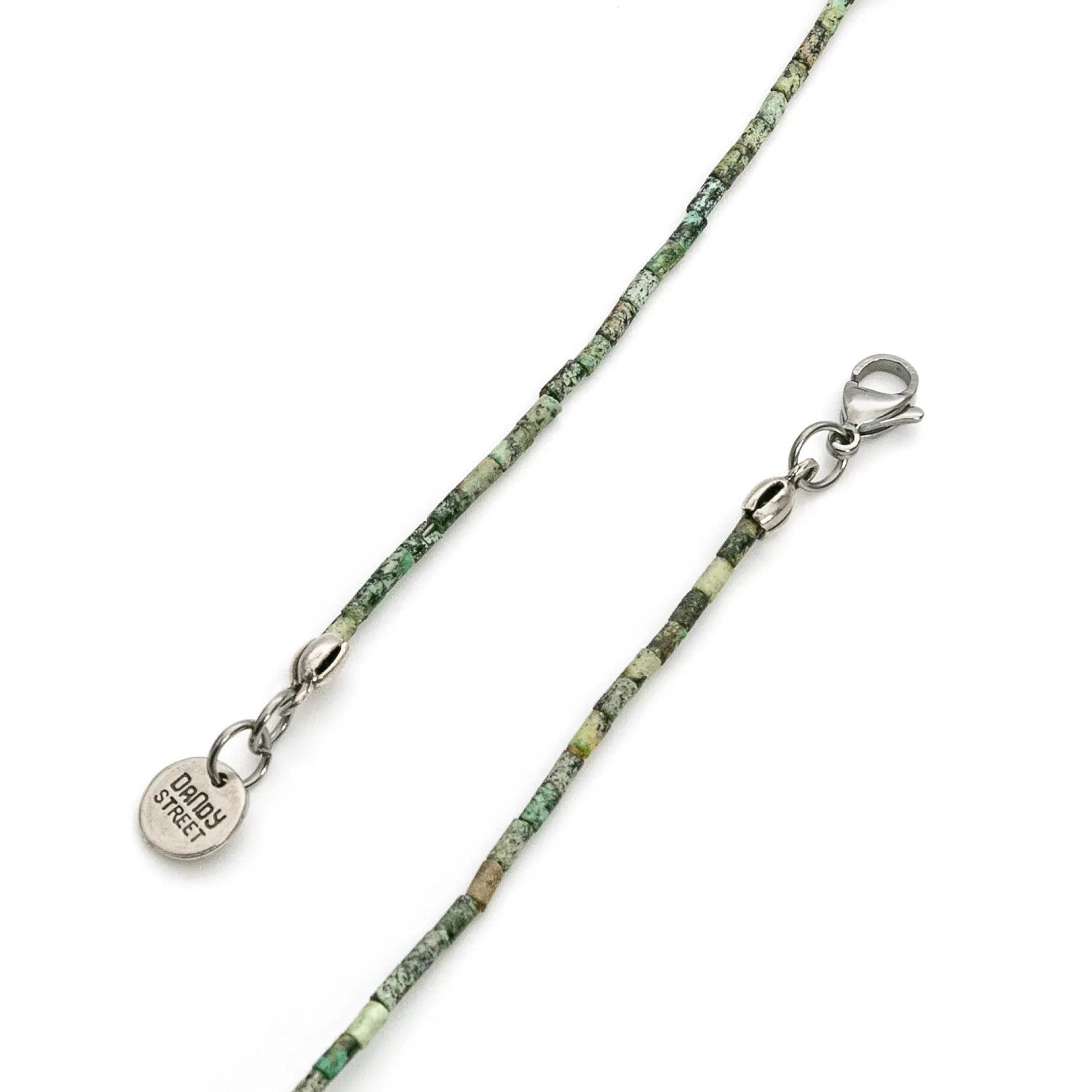 Yekos is a men's necklace handmade in Italy, an accessory that enchants with its timeless elegance and the authenticity of the natural stones used, which convey a message of strength and harmony. African turquoise, a symbol of protection and healing, combines with turquoise aulite, bearer of balance and wisdom.