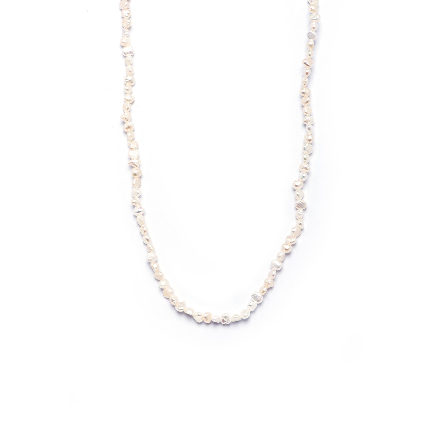 Entirely made of freshwater pearls, each with its irregular shape and shimmering finish, this necklace expresses a spontaneous elegance that perfectly suits contemporary and relaxed looks. The final effect is harmonious yet distinctive, ideal for those who want to add a unique detail without overdoing it.