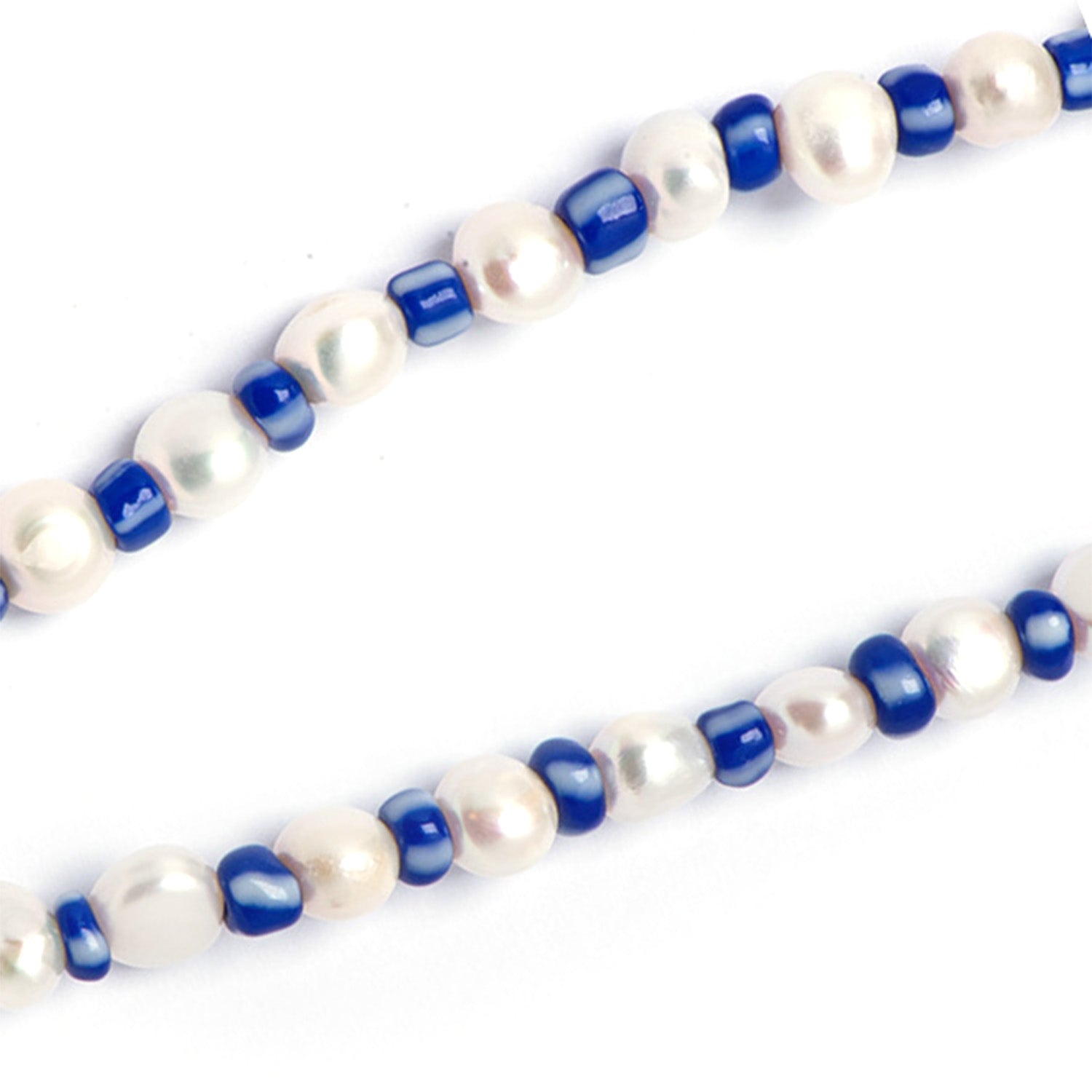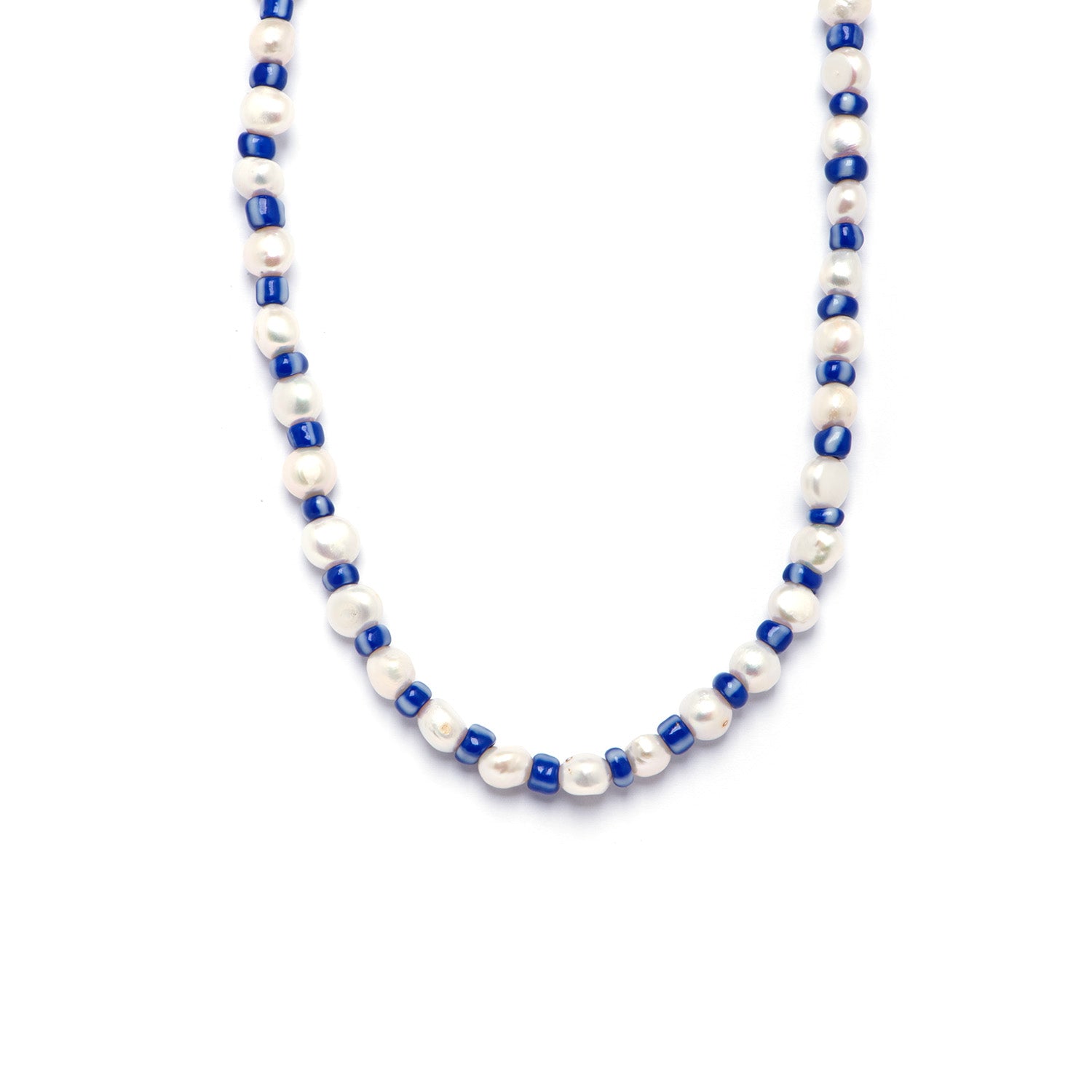 Made with large freshwater pearls and ethnic glass in intense colors, this necklace stands out for its balance between elegance and freshness. The shades of white and blue create a bright and harmonious contrast, ideal for enhancing both casual outfits and more sophisticated looks.