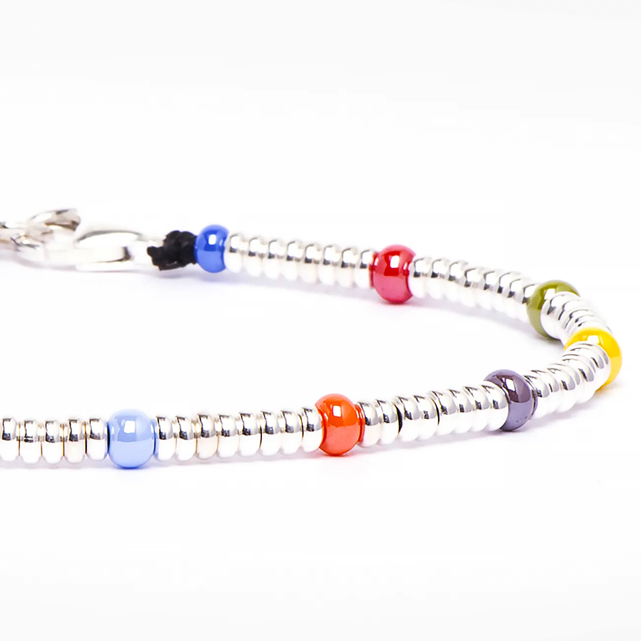 Etan is a men's bracelet handmade with elements cast in 925 Silver and structured with a braided nylon wire that is water-resistant. This men's bracelet is enhanced with glass beads in various colors. It features a lobster clasp closure.