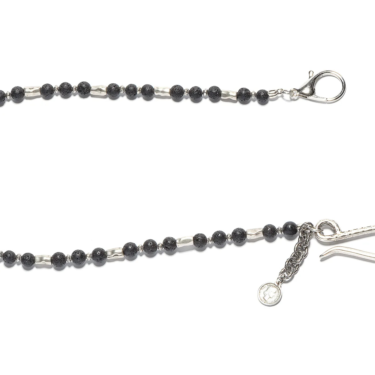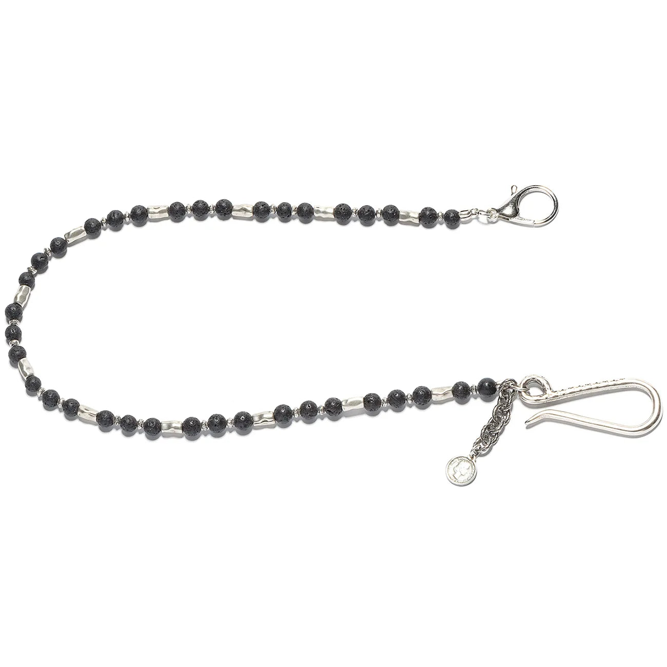 Gaspar is a men's trouser chain handmade with natural lava stone beads. The front hook is enhanced by a 5cm long pendant with an antique coin. All the fittings of this men's trouser accessory are silver plated.