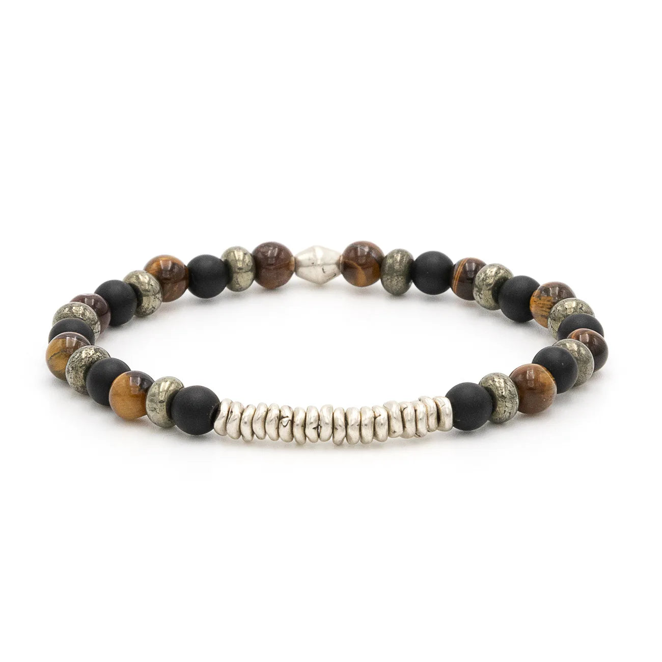 Malm is an elastic men's bracelet handmade in Italy with natural pyrite rondelle stones, tiger's eye, and matte onyx measuring 6mm, along with silver-plated discs. The findings of this men's bracelet are plated with 5-micron silver.