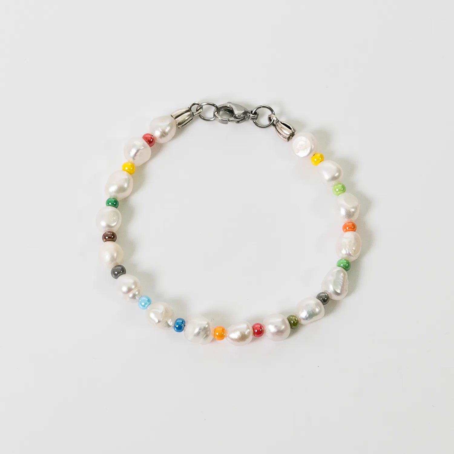 • Stones: 8mm white freshwater pearls and 3mm multicolored ethnic glass beads